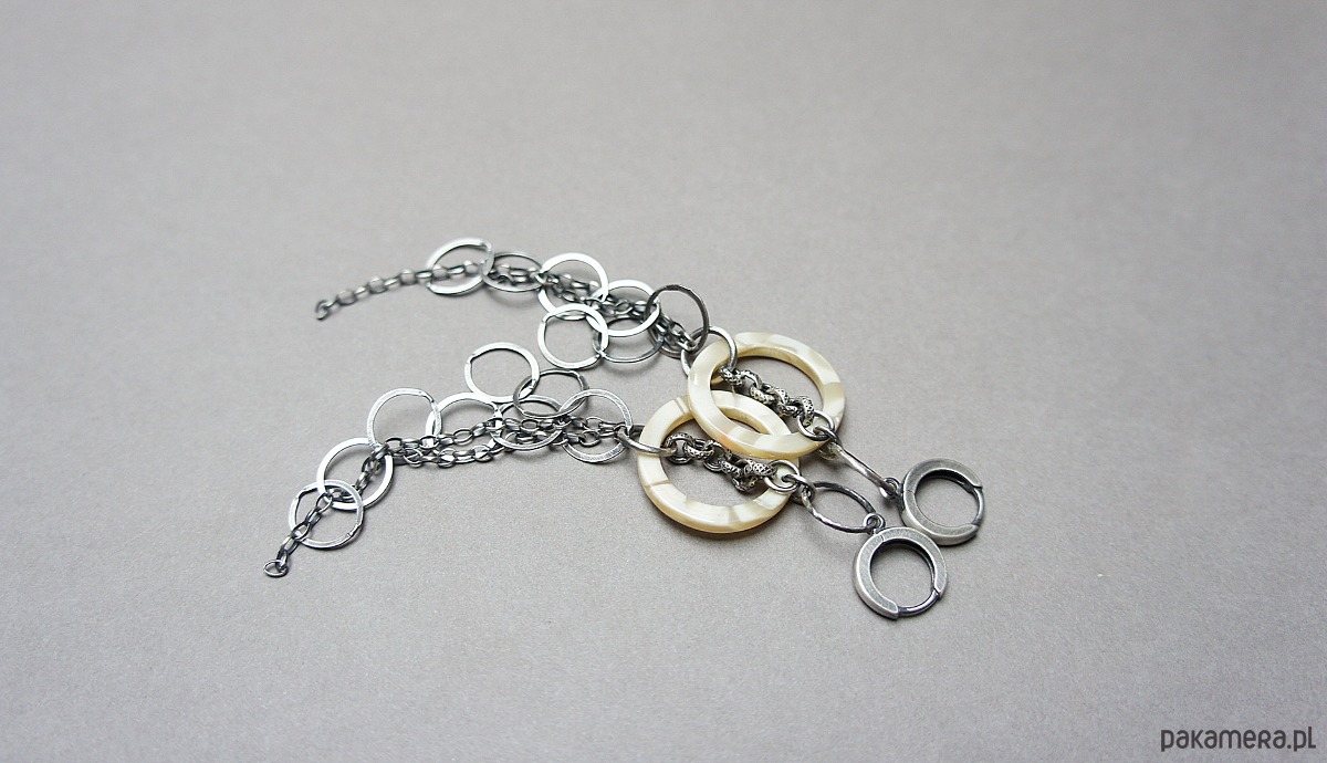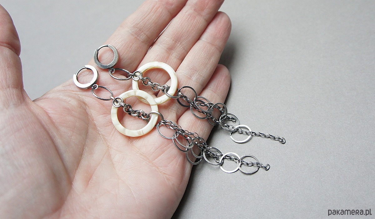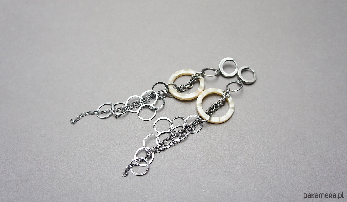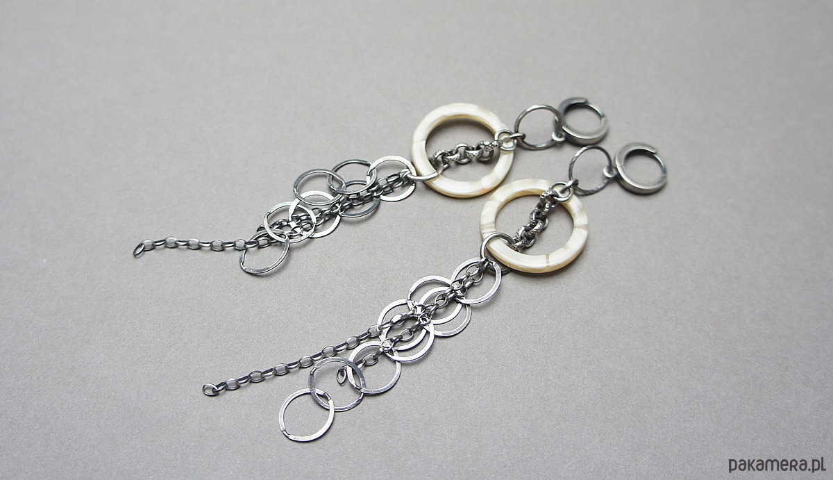 Kolczyki wykonane ze srebra [pr.925] w połączeniu z obręczami z żywicy [śr.22mm] .Srebro oksydowane i przetarte. Całkowita długość kolczyków około 11cm. Biżuteria ozdobnie zapakowana.