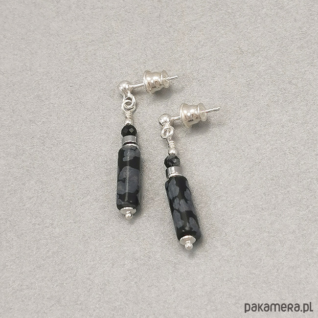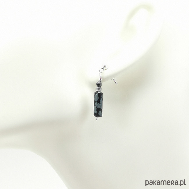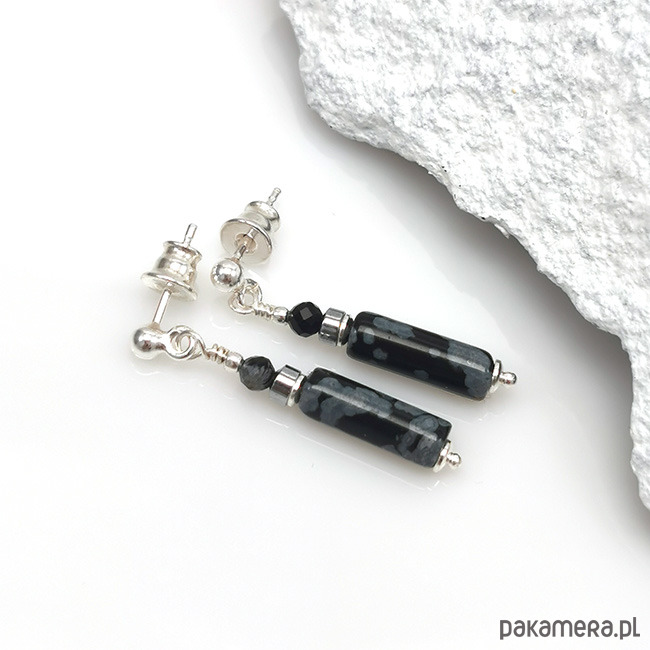 Delikatne kolczyki z obsydianem śnieżnym i hematytami. Kamienie w rozmiarze 2mm do 3mm i walce 12x4mm. Wykonane ze srebra próby 925. Bigle sztyfty. Długość z biglami 3,1cm. Opakowane w firmowe pudełeczko.