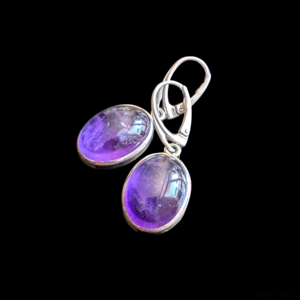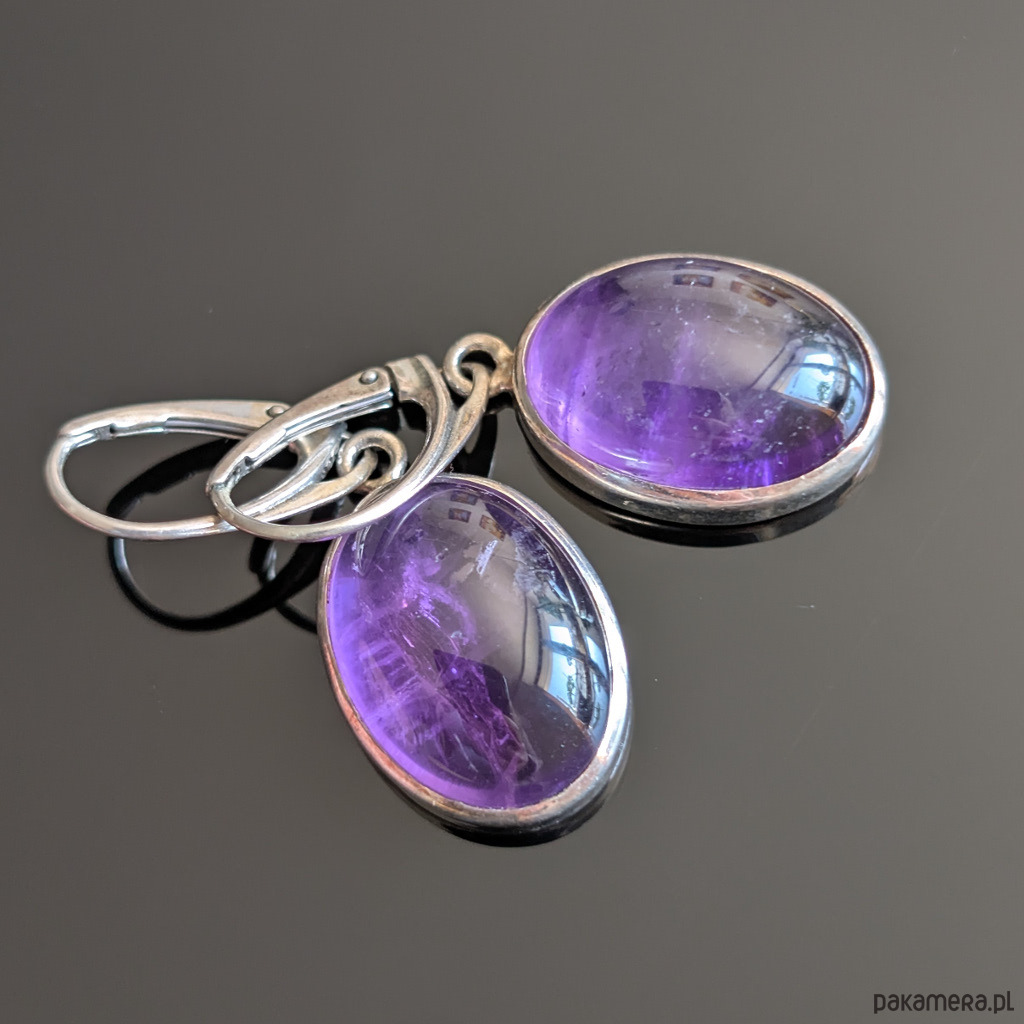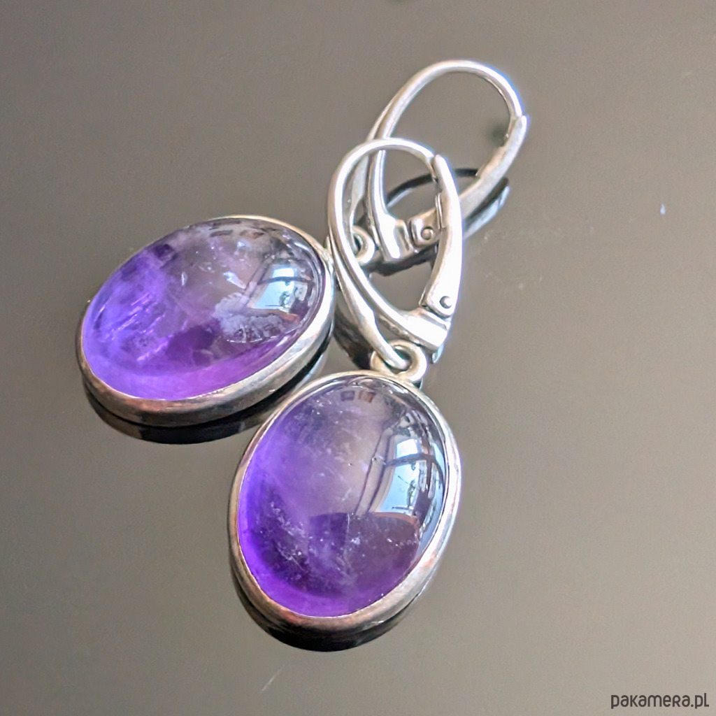 Piękne ametysty o fioletowej tafli w oprawie srebra próby 925. Oprawa w jasnym srebrze. Wymiary elementów 19 x 13 mm. Długość 39 mm. Bardzo efektowne. Waga jednego kolczyka 4,8 g. Kolczyki zostaną wysłane w ozdobnym pudełeczku.