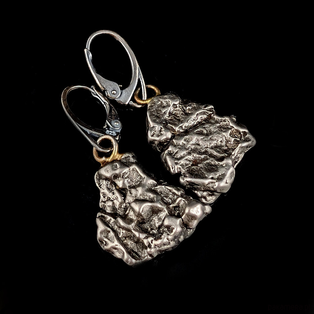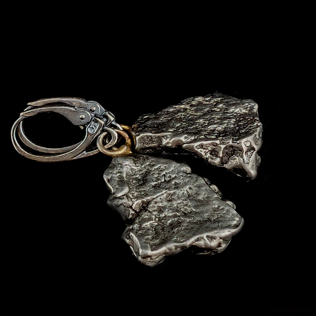 Kosmiczne kolczyki z meteorytami Campo Del Cielo (Argentyna) o kształcie nieregularnych bryłek na biglach angielskich ze srebra próby 925. Wymiary elementów 20 x 15 mm. Długość z biglami angielskimi 38 mm. Lekkie, komfortowe i bardzo efektowne. Waga jednego kolczyka 5,5 grama. Kolczyki zostaną wysłane w ozdobnym pudełeczku.