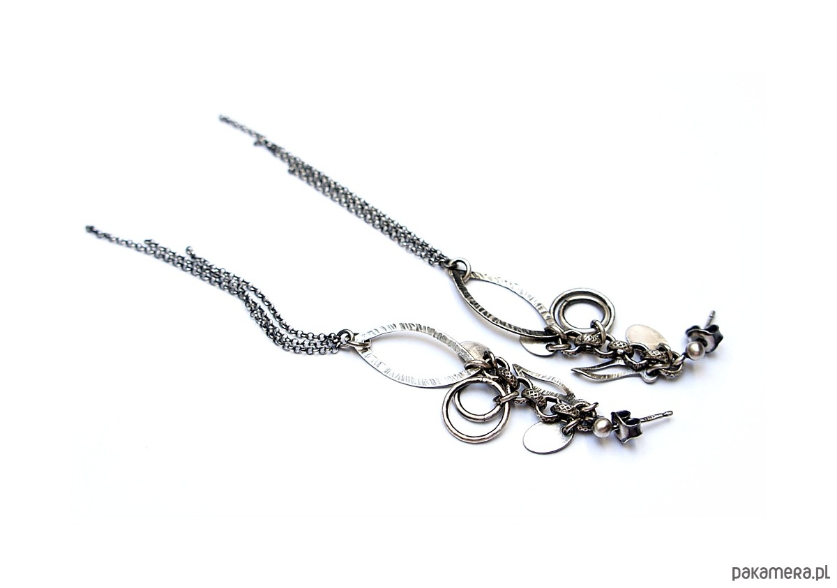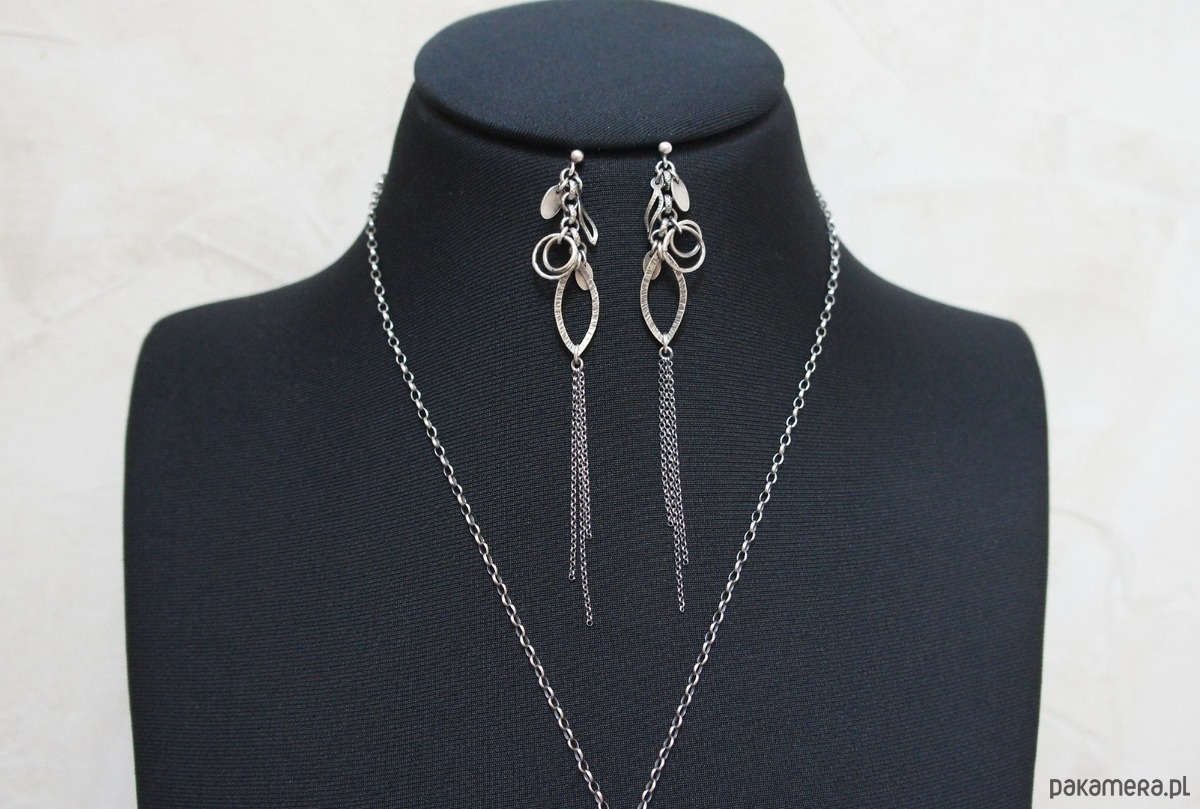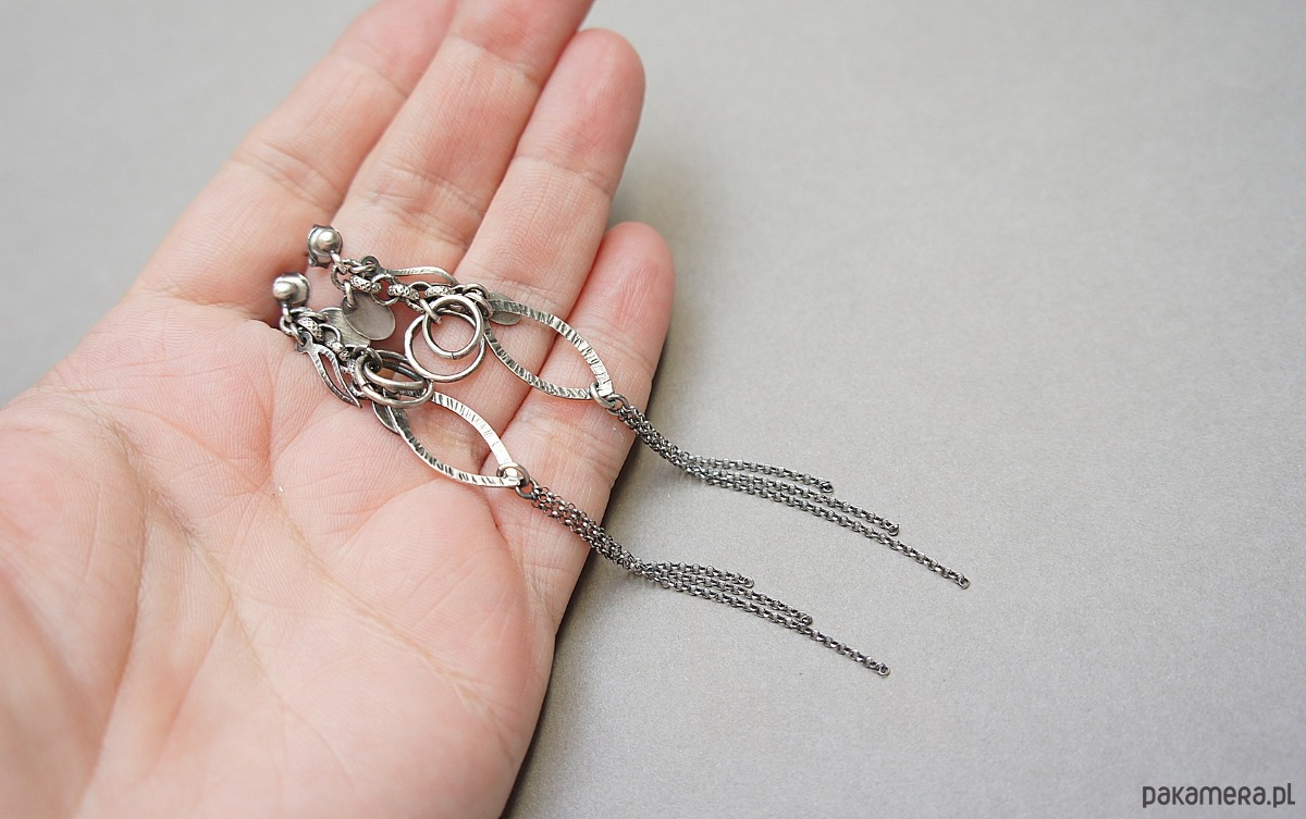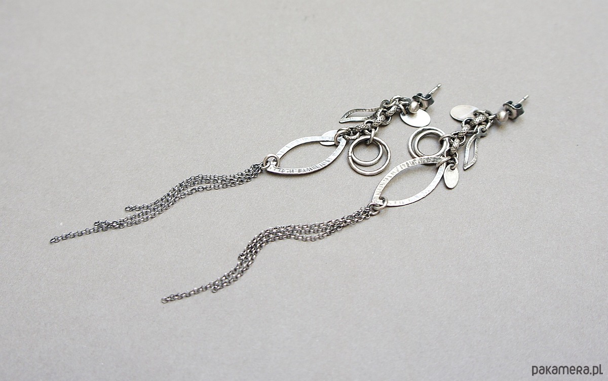 Kolczyki wykonane ze srebra [pr. 925] . Całość oksydowana i przetarta. Całkowita długość kolczyków ok. 10,5cm. Biżuteria ozdobnie zapakowana