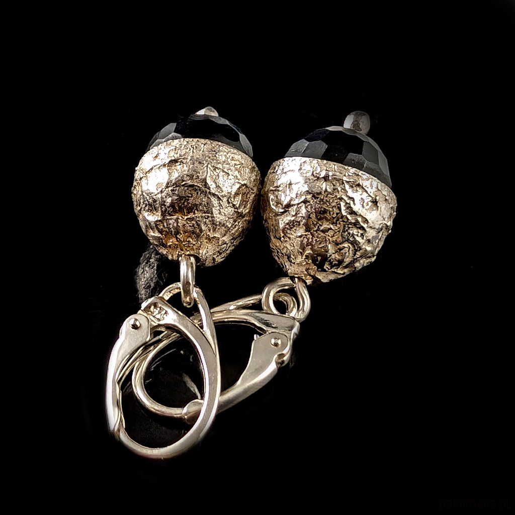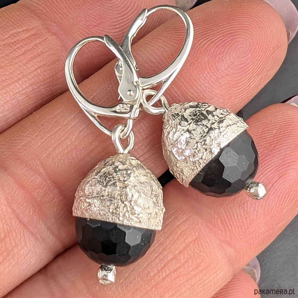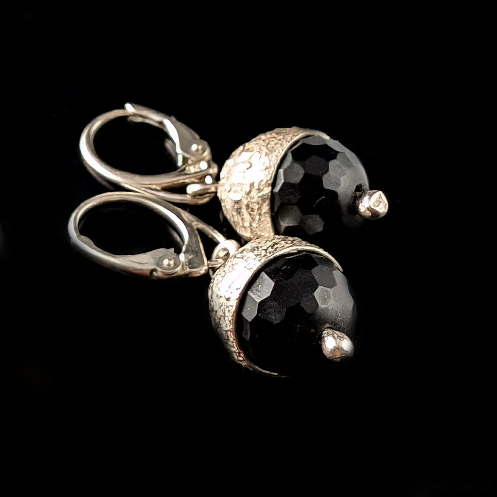 Kolczyki wykonane ze srebra próby 925 oraz pięknych, fasetowanych onyksów. Czapeczki dębowe wykonane ze srebra.