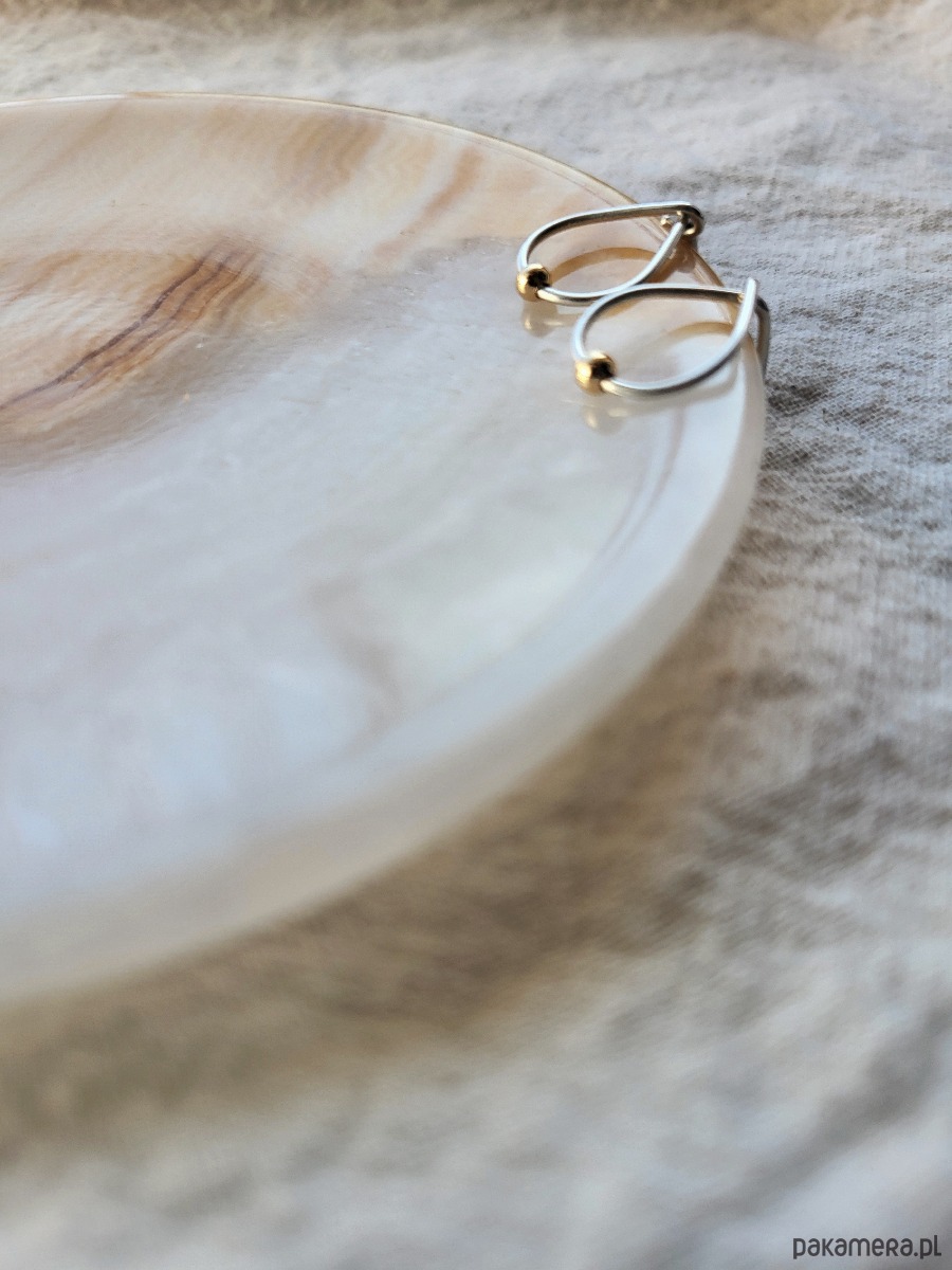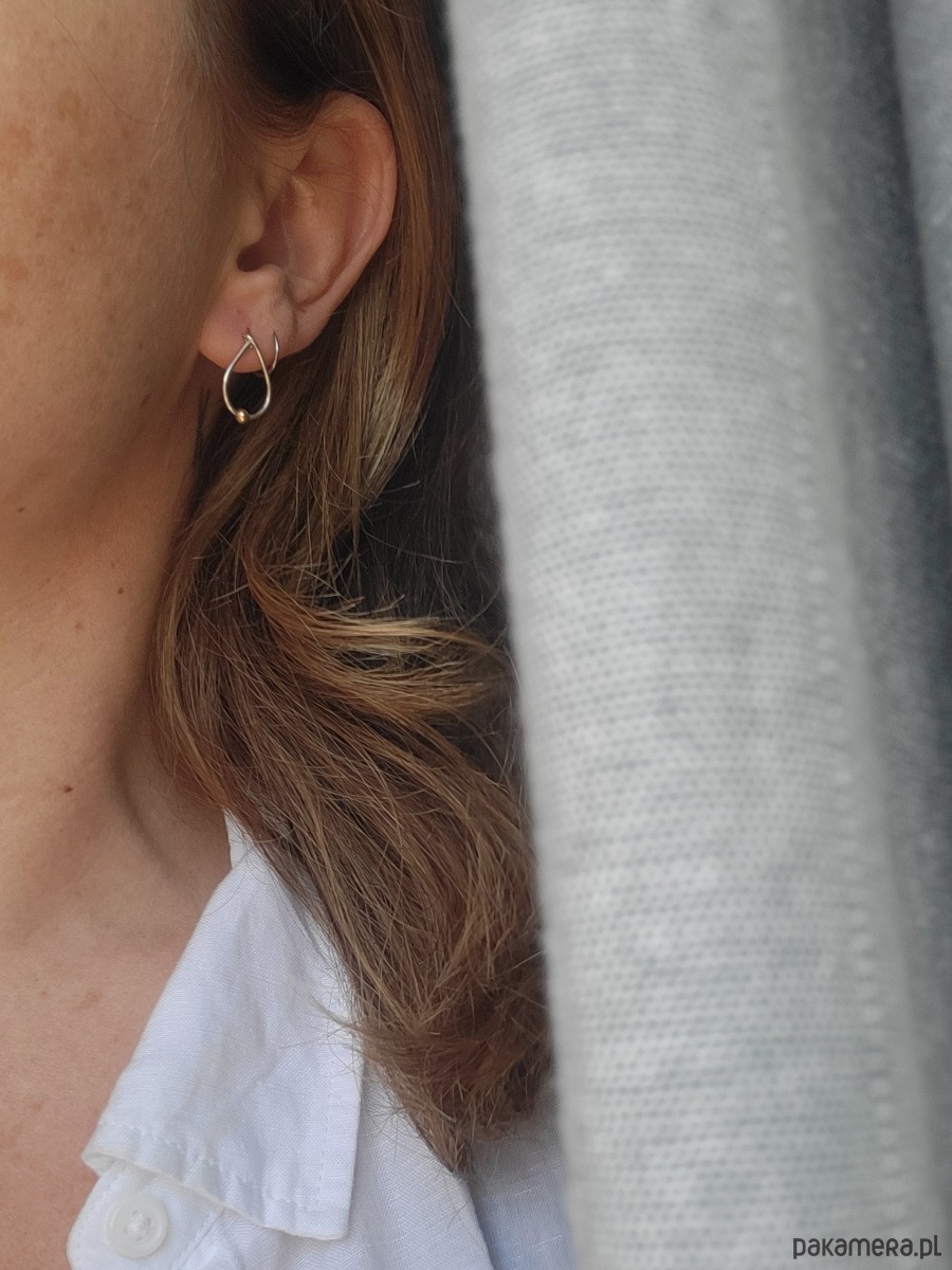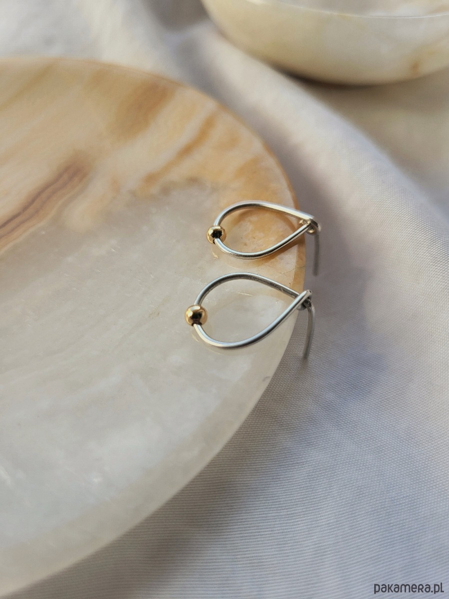 Minimalistyczne, ultralekkie kolczyki z miniserii ORIGIN w kształcie kropli. Wykonane ręcznie z wtórnie przetworzonego srebra, wykończone mosiężną, pozłacaną kuleczką.*