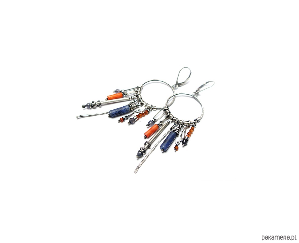 Kolczyki wykonane ze srebra [pr. 925] w połączeniu z wałeczkami korala pomarańczowego i sodalitów [10mm i 13mm], fasetowanymi kuleczkami iolitów [3mm],fasetowanymi granatami [2mm - hessonit] oraz cyrkoniami [3mm]. Średnica kutych kół [24mm]. Srebro oksydowane i przetarte. Całkowita długość kolczyków 8,2cm. Biżuteria ozdobnie zapakowana.