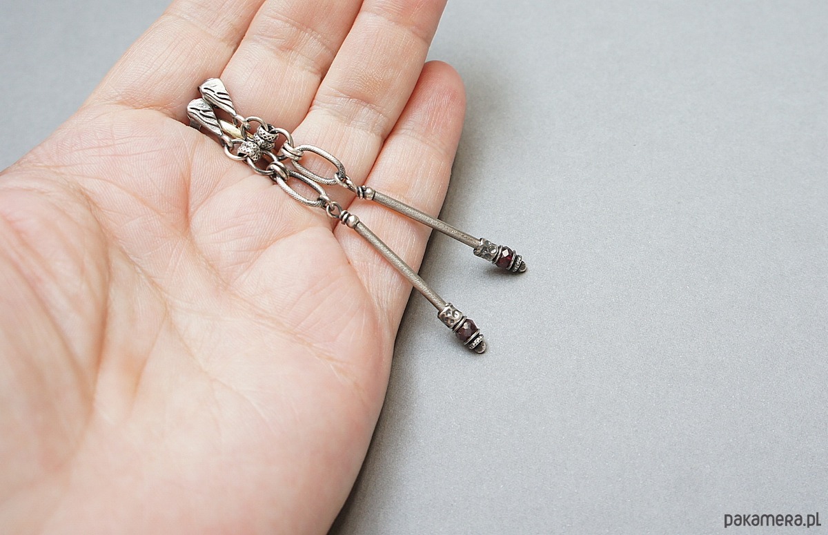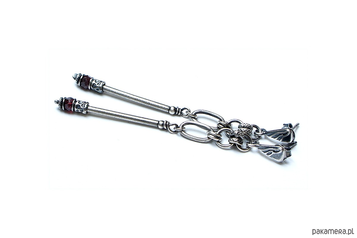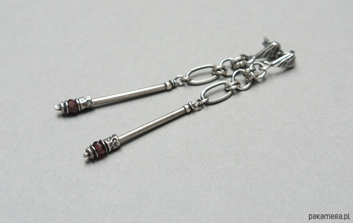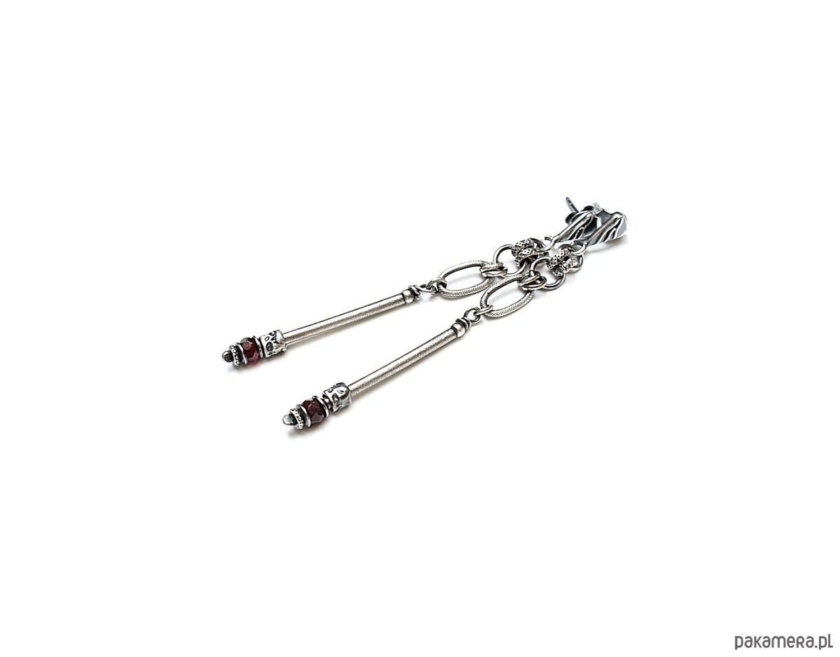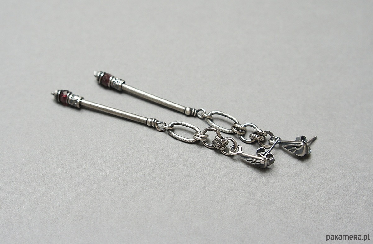 Kolczyki wykonane ze srebra [pr. 925] w połączeniu z naturalnymi kamieniami: fasetowanymi granatami [śr. 4mm]. Srebro oksydowane i przetarte. Całkowita długość kolczyków 7,2cm. Biżuteria ozdobnie zapakowana.