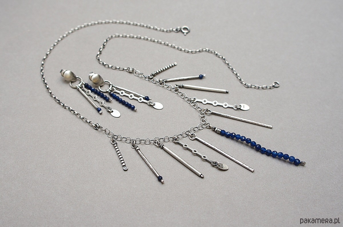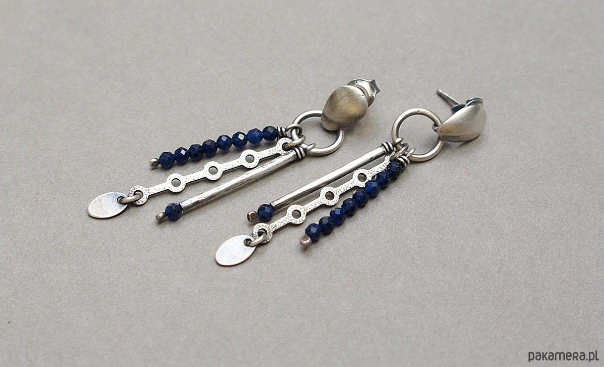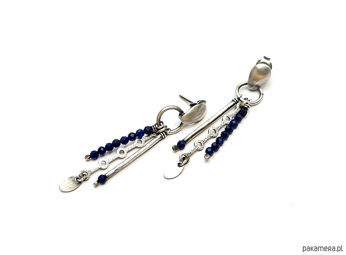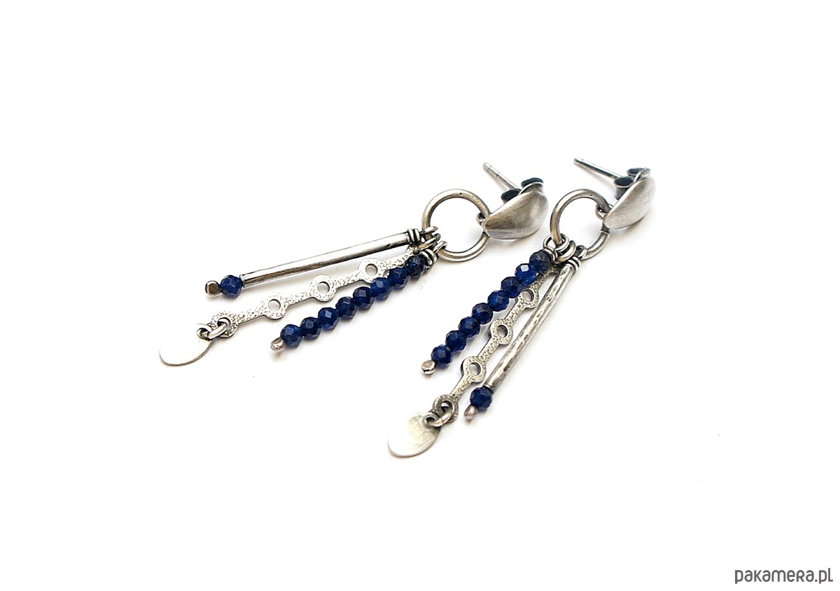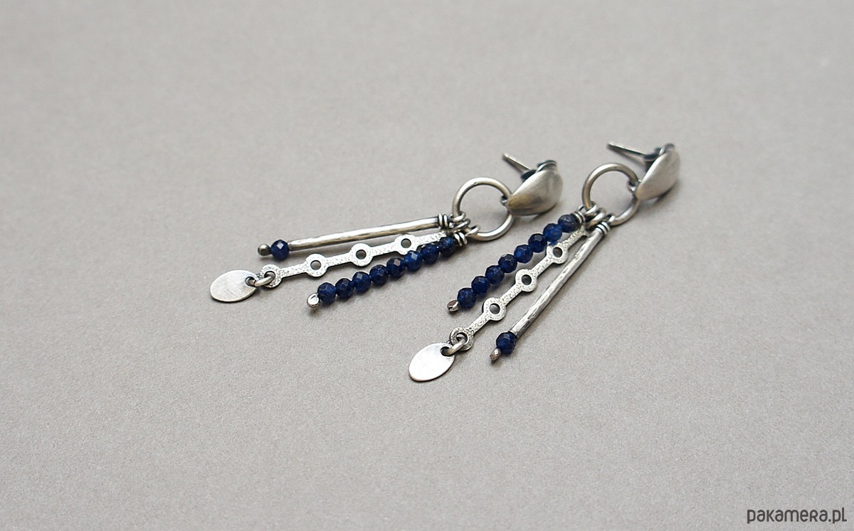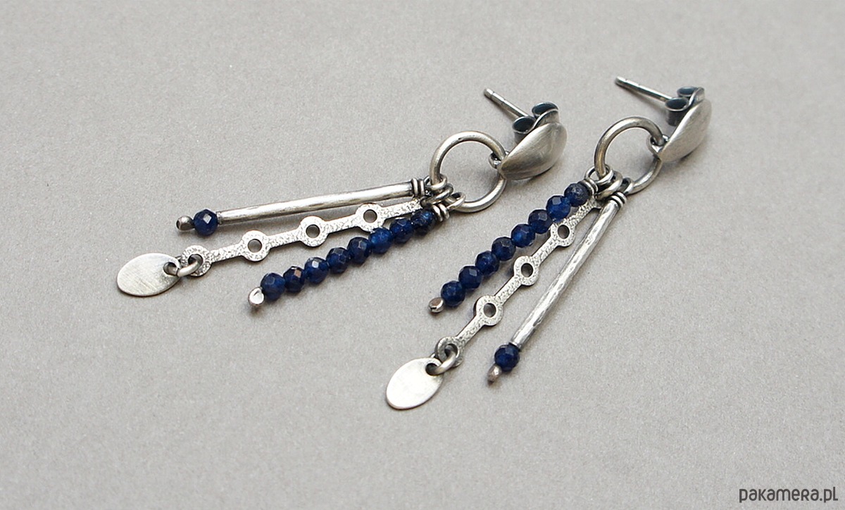 Kolczyki wykonane ze srebra [pr. 925 ] w połączeniu fasetowanymi kuleczkami szafirów [2mm - syntetyczne]. Srebro oksydowane i przetarte. Całkowita długość kolczyków około 5cm. Biżuteria ozdobnie zapakowana.