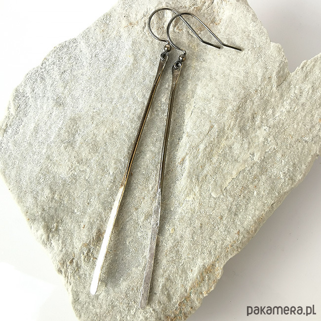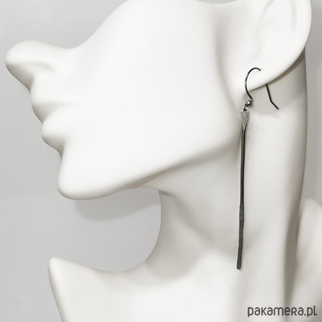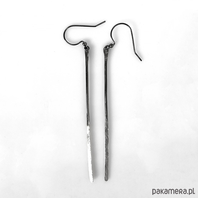 Bardzo klasyczne i proste kolczyki wykonane z oksydowanego, młotkowanego srebra. Długość razem z biglami: 9,4cm. Opakowane w pudełeczko firmowe.