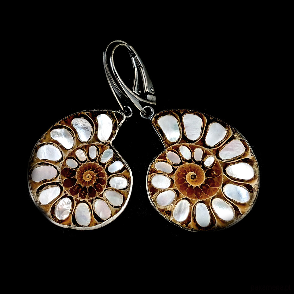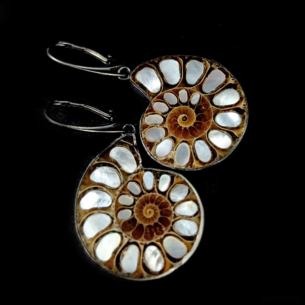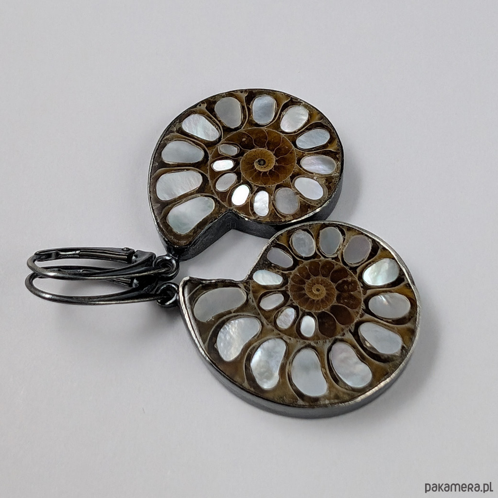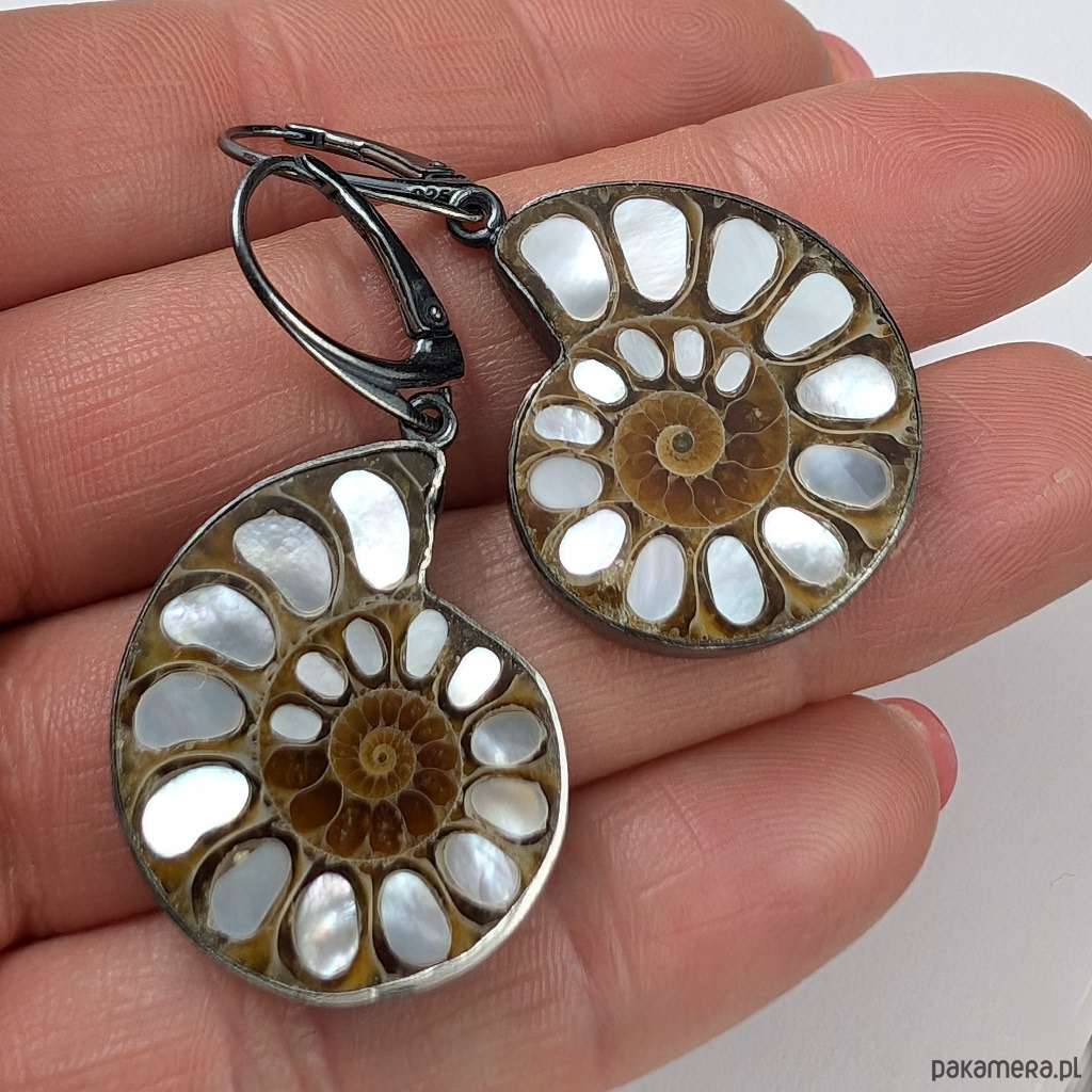 Piękne amonity inkrustowane masą perłową. Kamienie oprawione w srebro próby 925. Wymiary oprawy 27 x 22 mm, długość z biglami angielskimi 45 mm. Waga jednego kolczyka 7,16 g. Polecam, są niezwykłe.