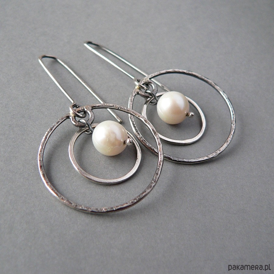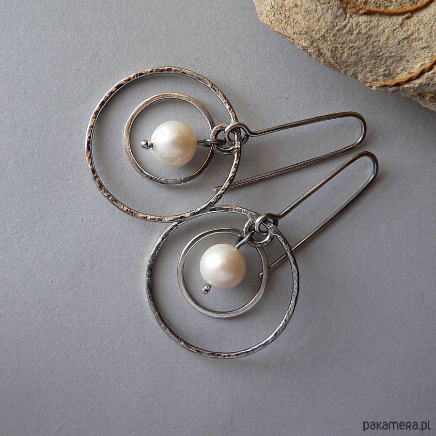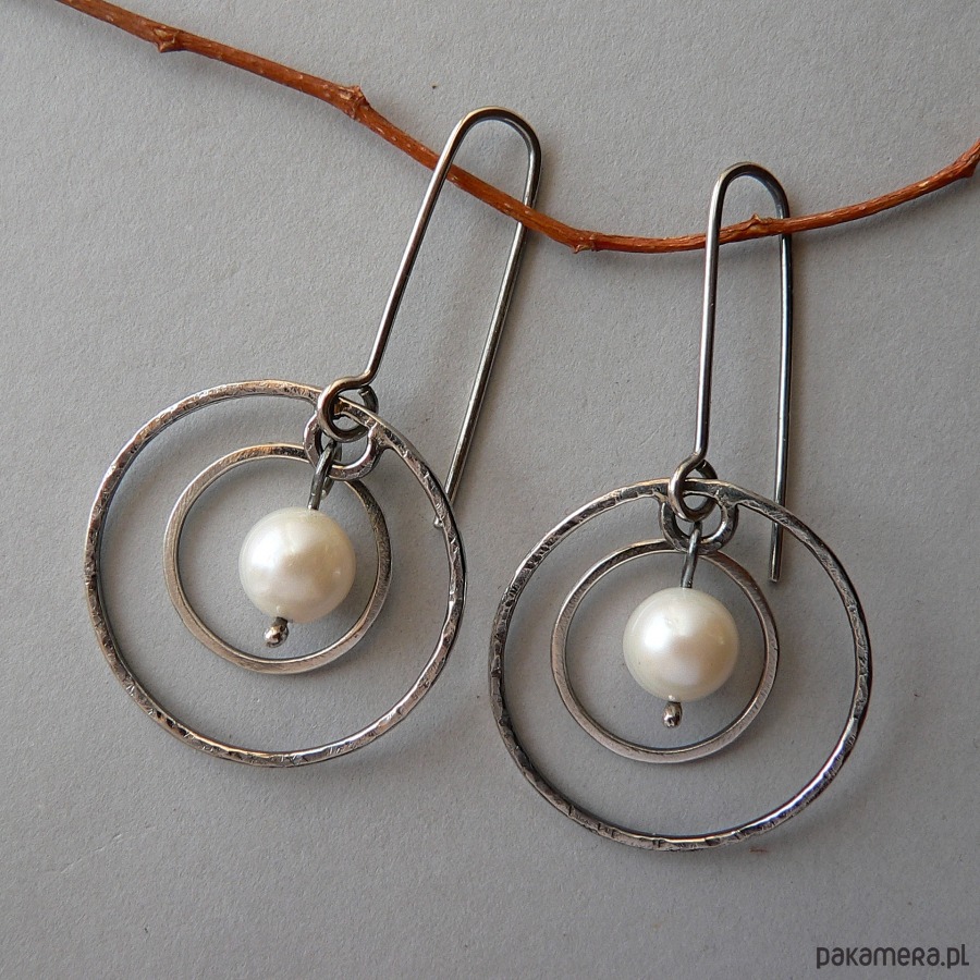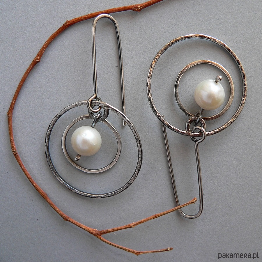Lekkie, długie kolczyki wykonane ze srebra i pereł. Srebrne koła różnią się średnicą i fakturą, całość oksydowana i polerowana. Długość całkowita kolczyka- 5,2 cm, średnica większego koła- 2,8 cm Średnica pereł- 8 mm
