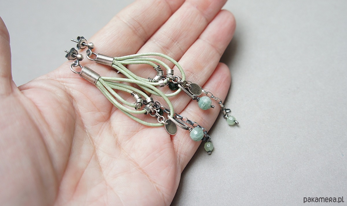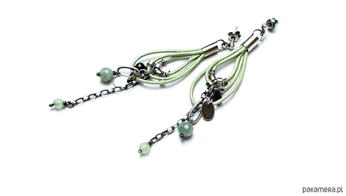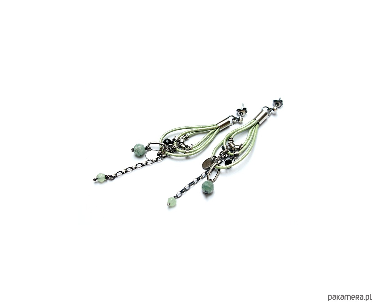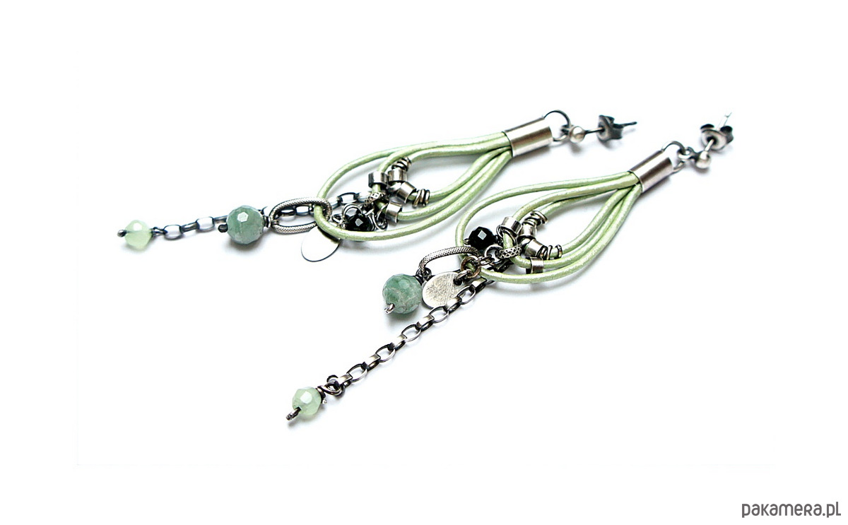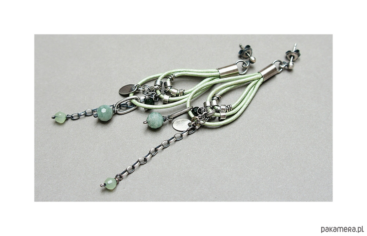 Kolczyki wykonane ze srebra [pr. 925] w połączeniu z fasetowanymi kuleczkami szmaragdów [6mm] ,jadeitów [4mm] ,szmaragdów nilu [4mm] oraz srebrnymi zawieszkami zawieszonymi na rzemieniu z naturalnej skóry-metalic green. Srebro oksydowane i przetarte. Całkowita długość kolczyków około 8,5cm. Biżuteria ozdobnie zapakowana
