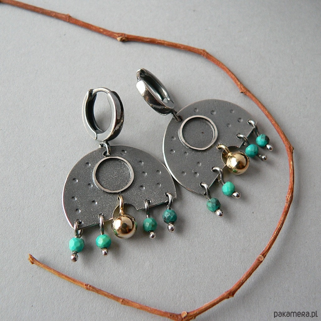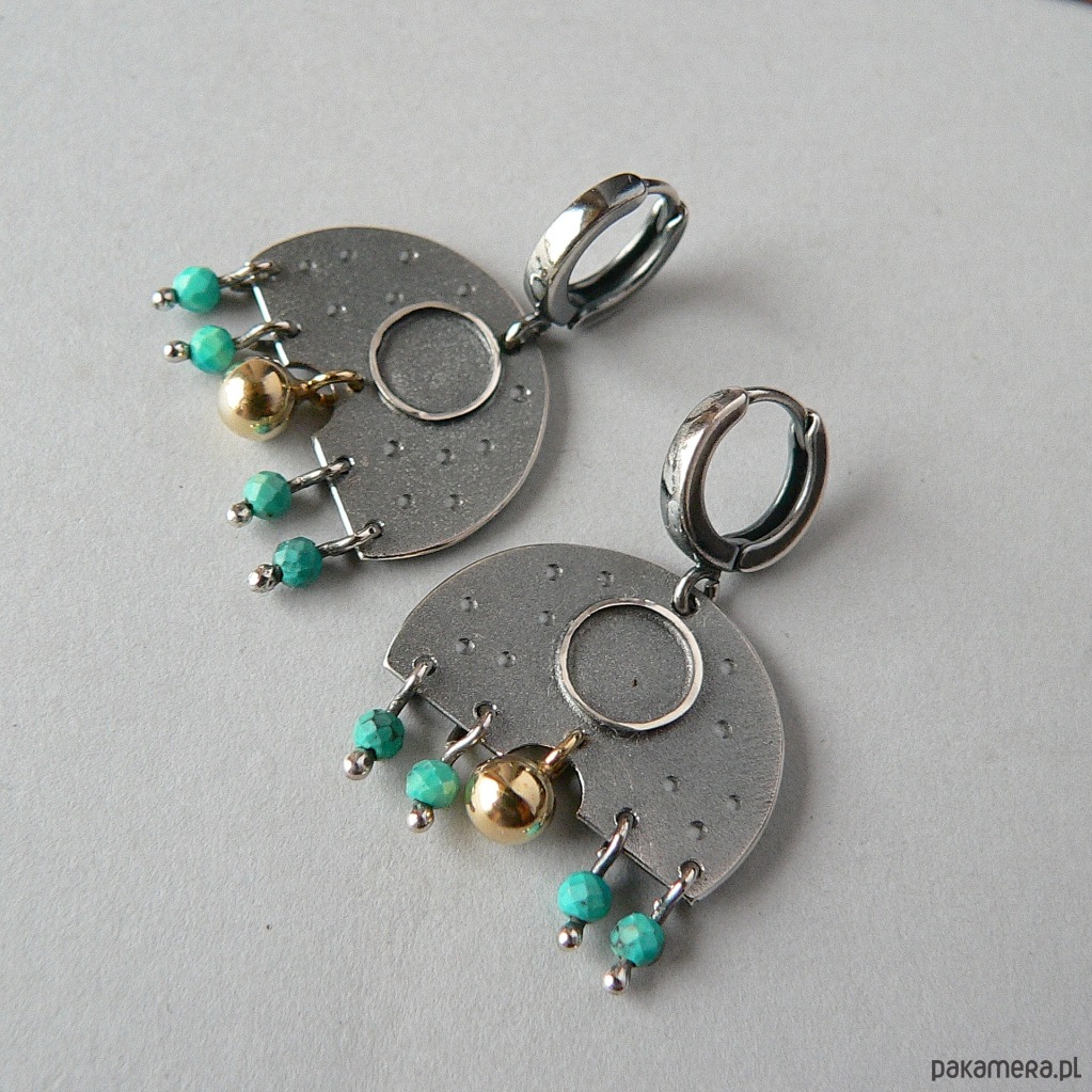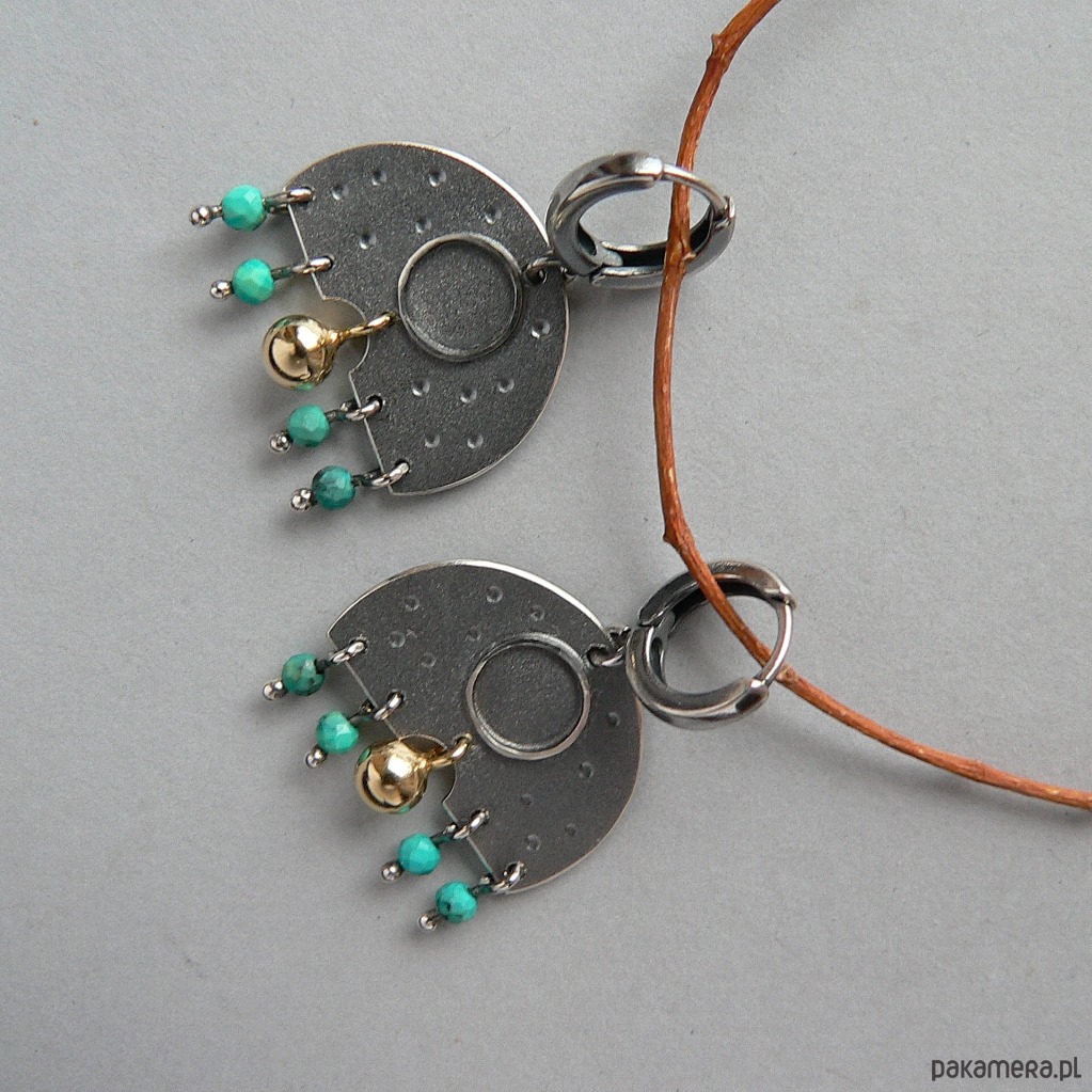 Lekkie, nieduże kolczyki wykonane ze srebra, drobnych, fasetowanych turkusów i pozłacanych, srebrnych kulek. Srebro oksydowane , piaskowane, detale polerowane. Wymiary srebrnego elementu 2,3/1,5 cm Średnica pozłacanych kulek 5 mm, średnica turkusów 3 mm Długość całkowita kolczyka 3,5 cm Zatrzaskowe zapięcia.