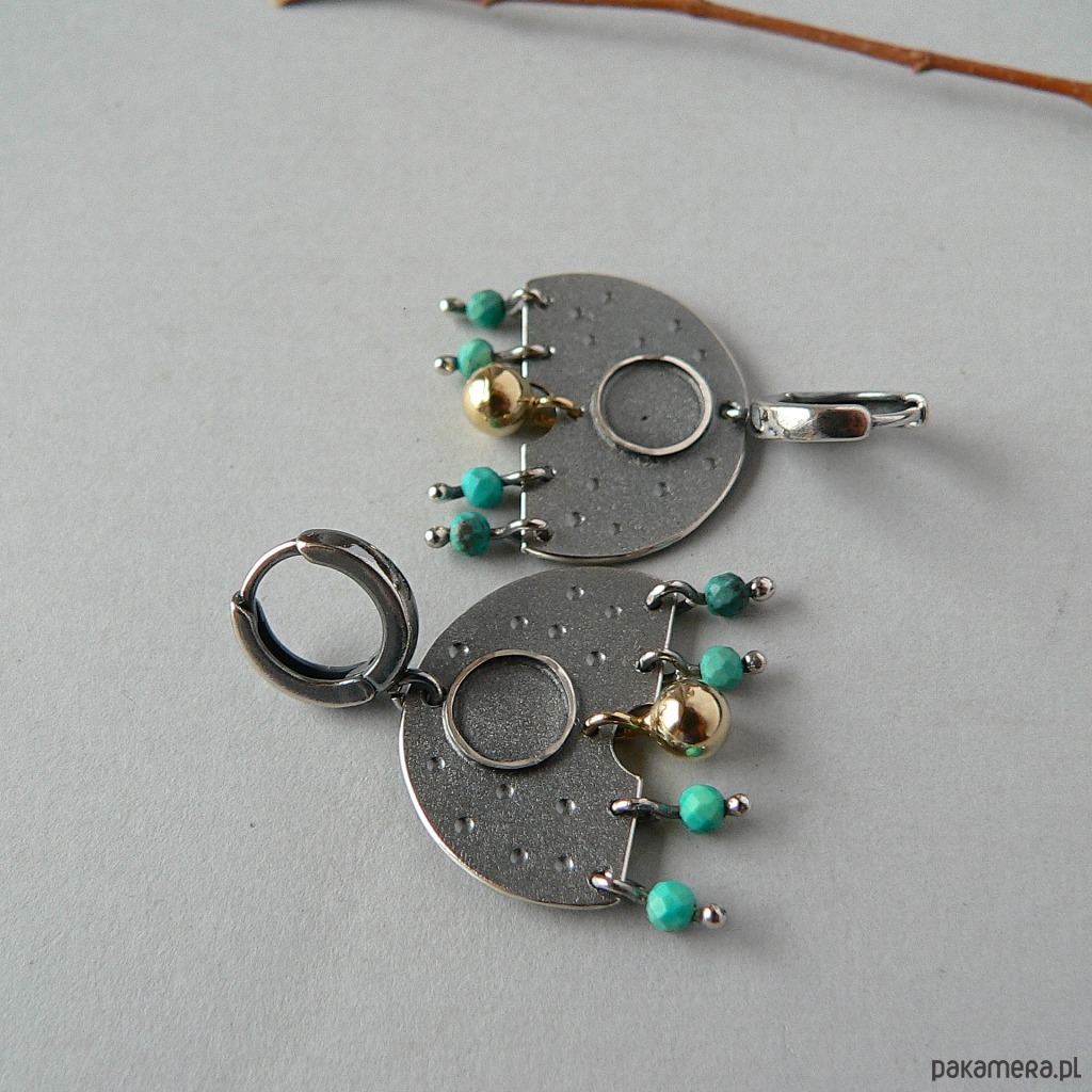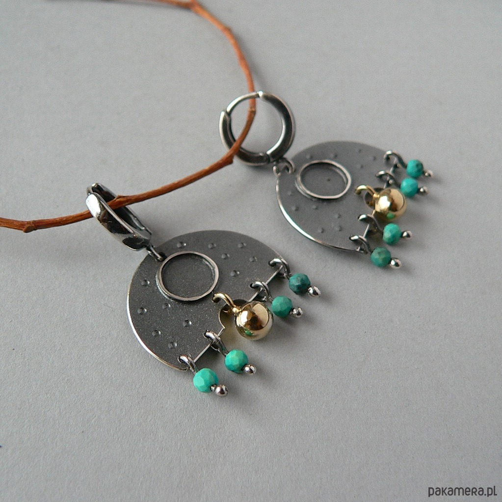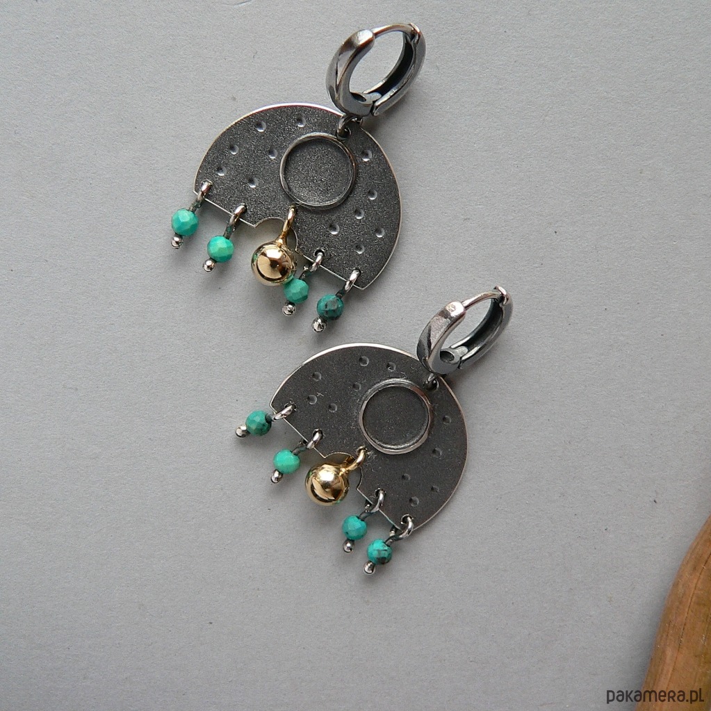 Lekkie, nieduże kolczyki wykonane ze srebra, drobnych, fasetowanych turkusów i pozłacanych, srebrnych kulek. Srebro oksydowane , piaskowane, detale polerowane. Wymiary srebrnego elementu 2,3/1,5 cm Średnica pozłacanych kulek 5 mm, średnica turkusów 3 mm Długość całkowita kolczyka 3,5 cm Zatrzaskowe zapięcia.