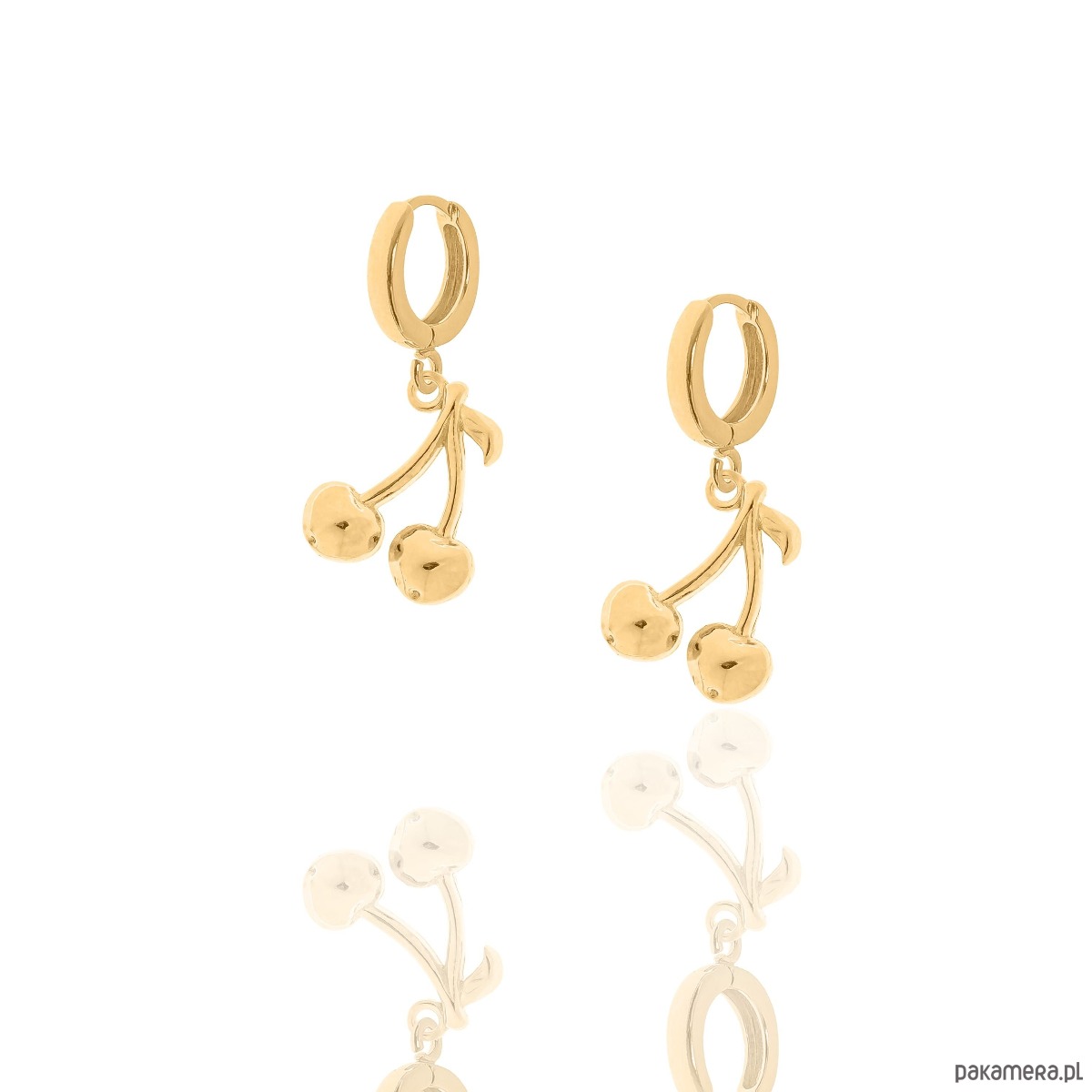 Kolczyki srebrne pozłacane z wisienkami. Zapinane na zatrzask. Całość wykonana ze srebra 925 pokrytego 24 karatowym żółtym złotem.