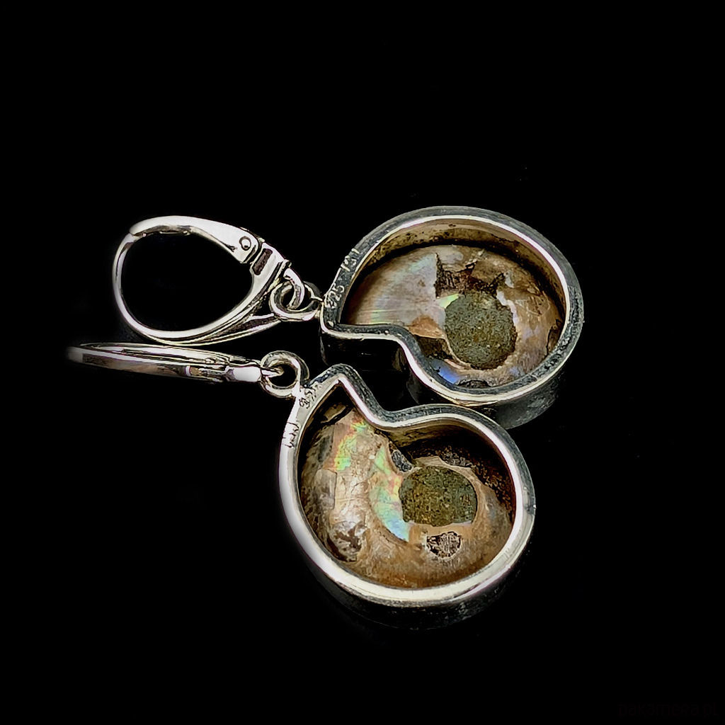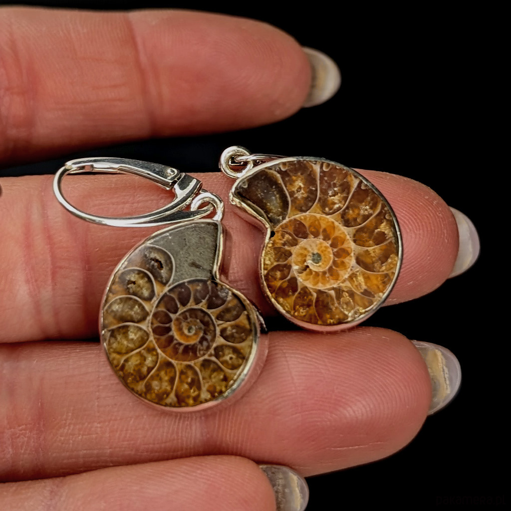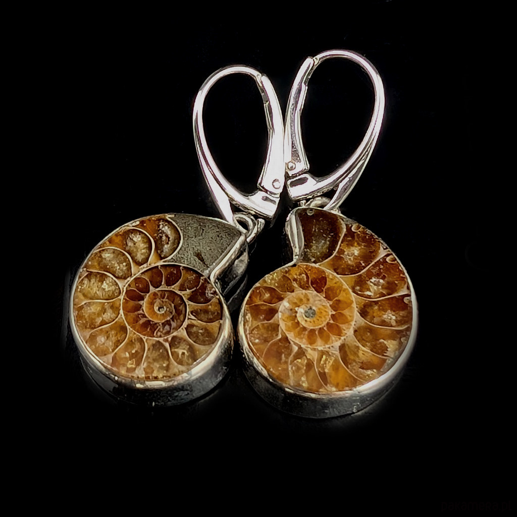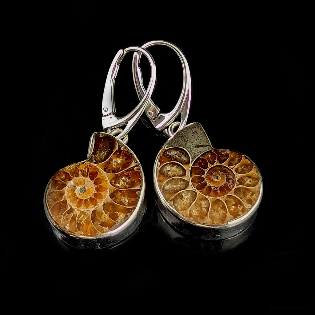Kolczyki wykonane ze srebra próby 925 oraz amonitów o pięknym ubarwieniu. Amonit to skamieniała muszla sprzed setek tysięcy lat. Pochodzenie: Maroko. Wymiary oprawy 20 x 16 mm. Długosć z biglami 38 mm. Waga jednego kolczyka 4,8 g. Polecam, piękne.
