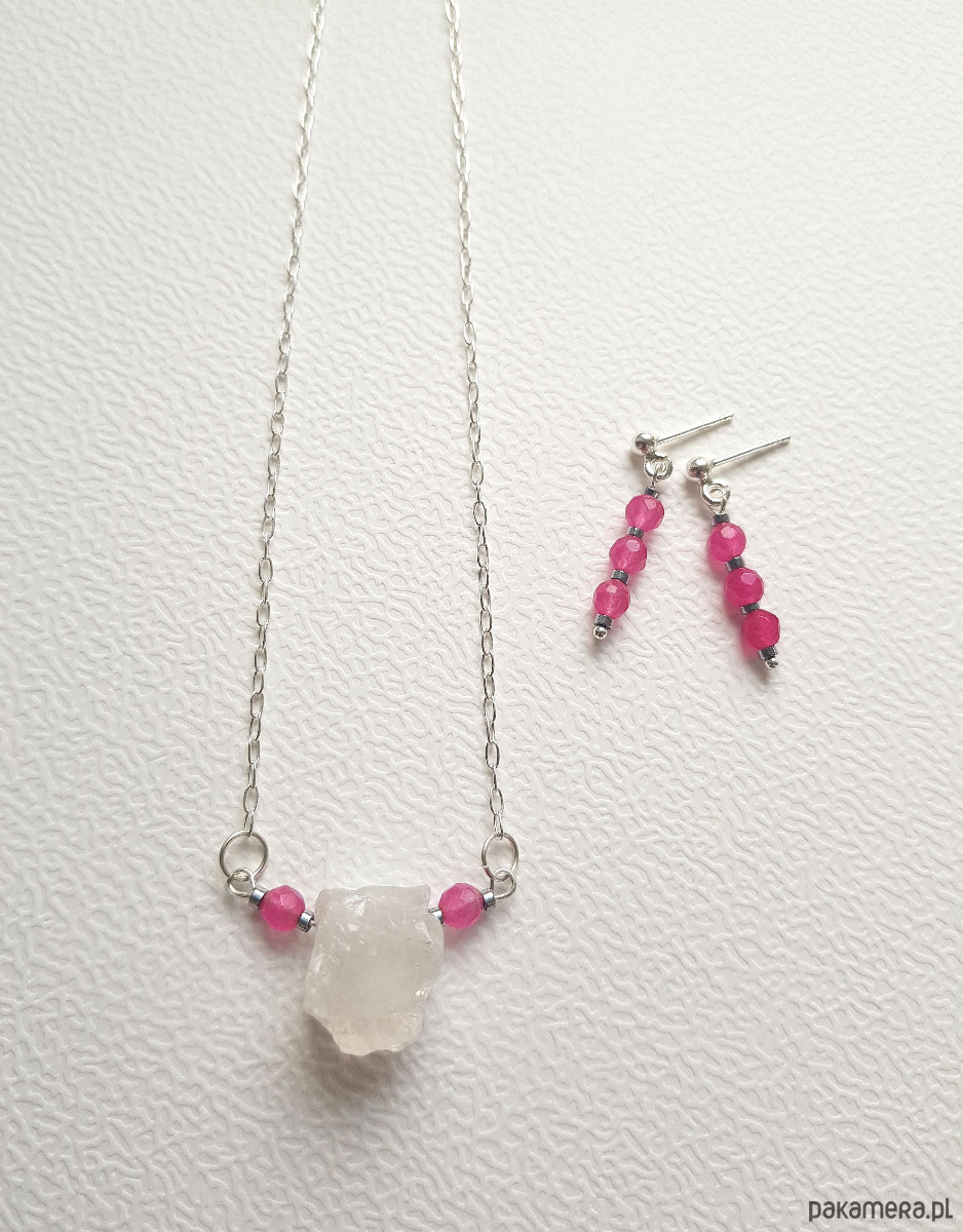 Wykonane z fasetowanego jadeitu w kolorze fuksji i drobnych srebrnych plasterków hematytu.