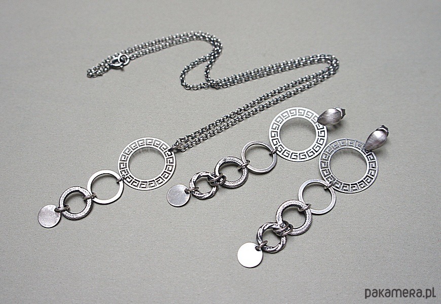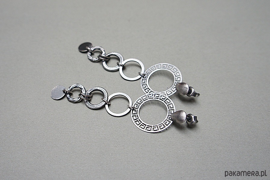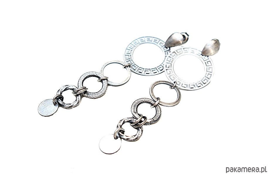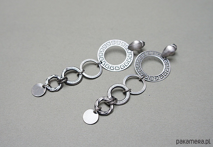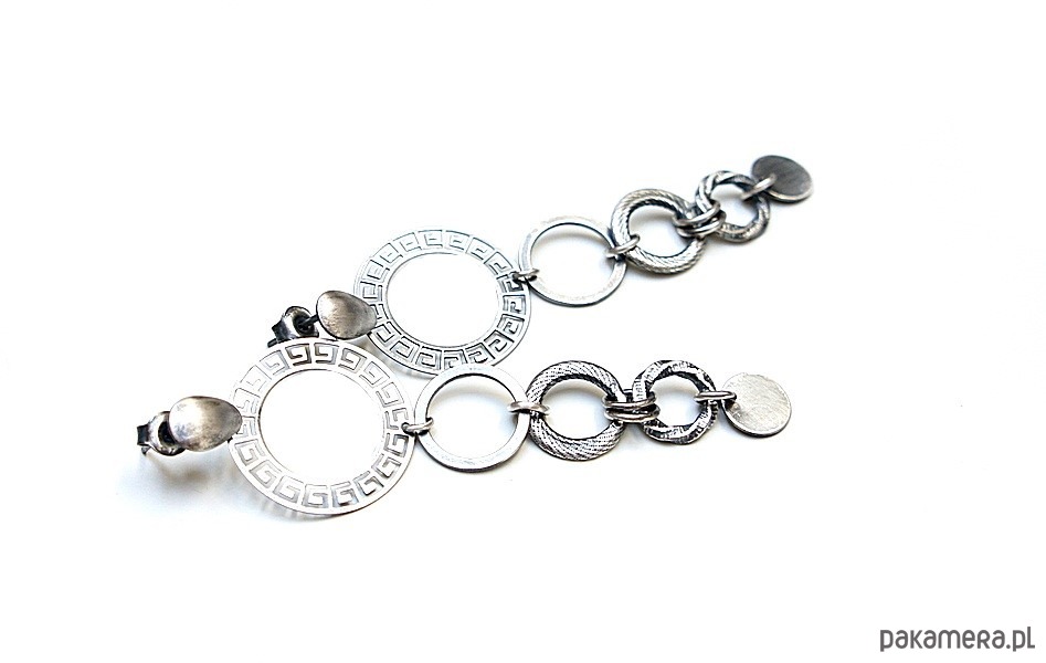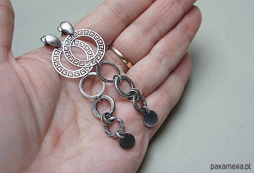 Kolczyki ze srebra [pr. 925] w połączeniu z różnej wielkości srebrnymi blaszkami i ogniwkami o zróżnicowanej fakturze. Srebro oksydowane i przetarte. Całkowita długość kolczyków 7,3cm. Biżuteria ozdobnie zapakowana.