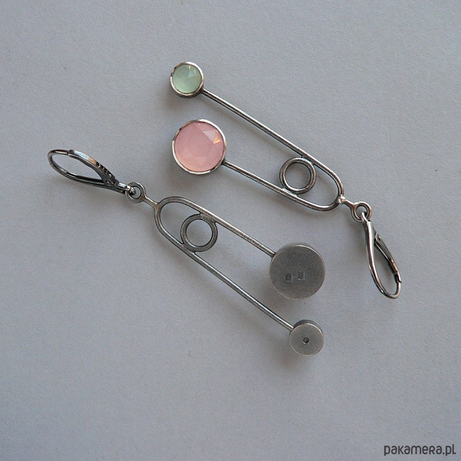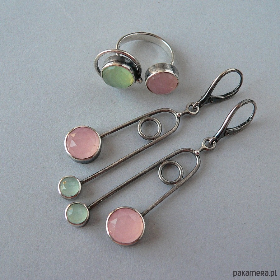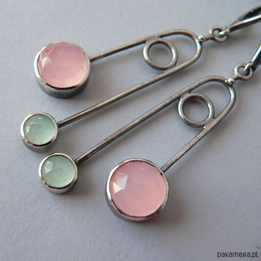Długie, lekkie kolczyki wykonane ze srebra i fasetowanych agatów w jasnoróżowym i miętowym odcieniu. Srebro pokryte wyraźną fakturą, oksydowane i polerowane. Średnica agatów 10 i 6 mm Długość całkowita kolczyka 7 cm, waga kolczyka 4,5 cm Bezpieczne i wygodne w obsłudze bigle angielskie. Możliwość zakupu pierścionka do kompletu.