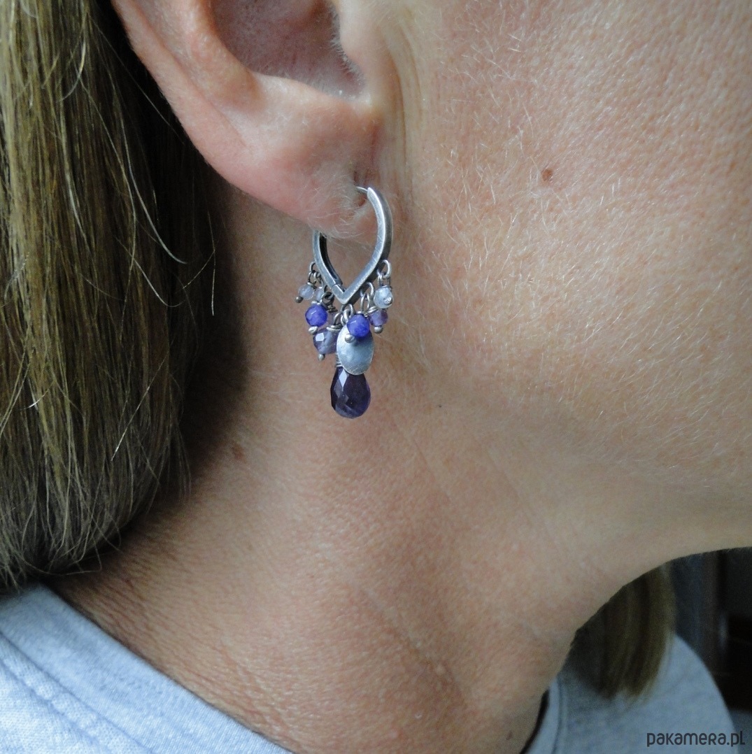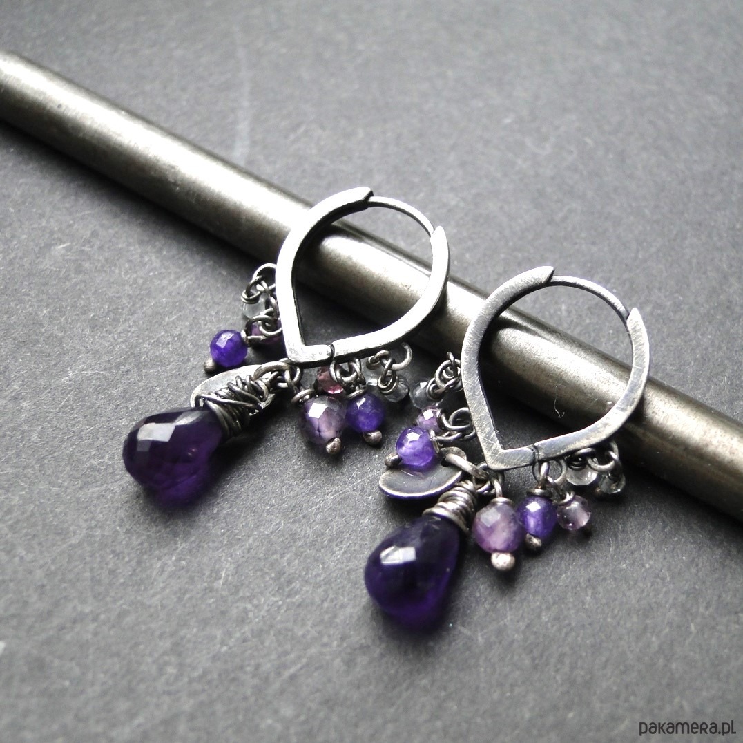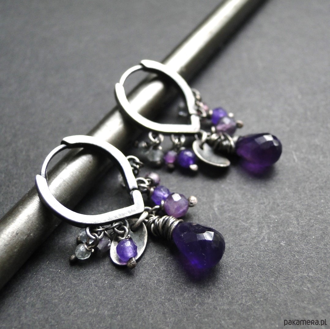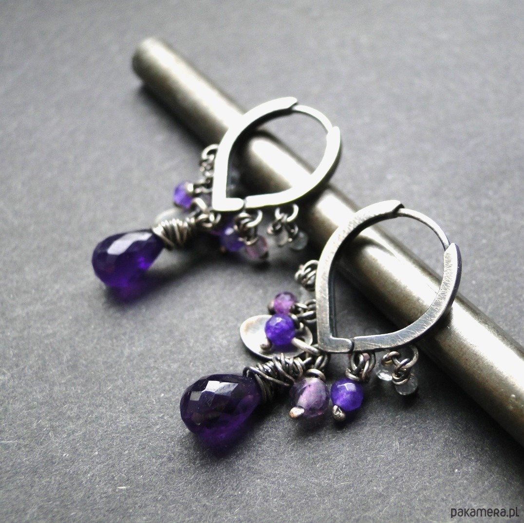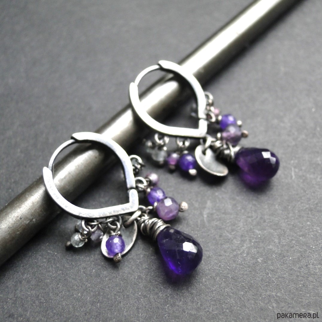 Ciekawe kolczyki w kolorze purpury. Srebro 925,oksydowane i szorowane. Kamienie: naturalny ametyst kropla, wysokiej klasy fluoryty i ametysty oraz agaty. Długość kolczyka -3,5 cm. Nie moczyć w wodzie.