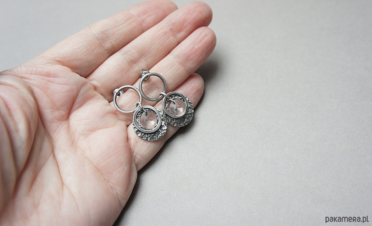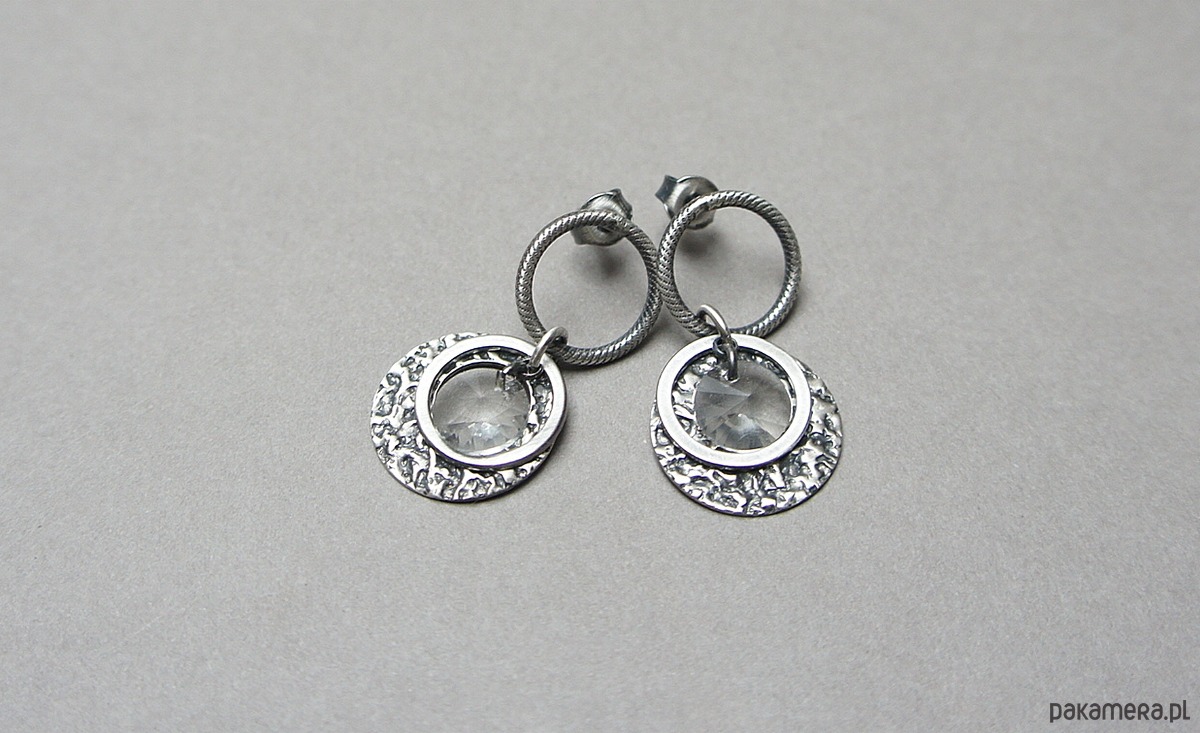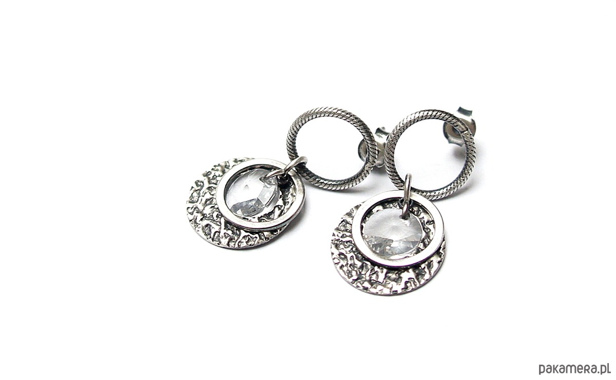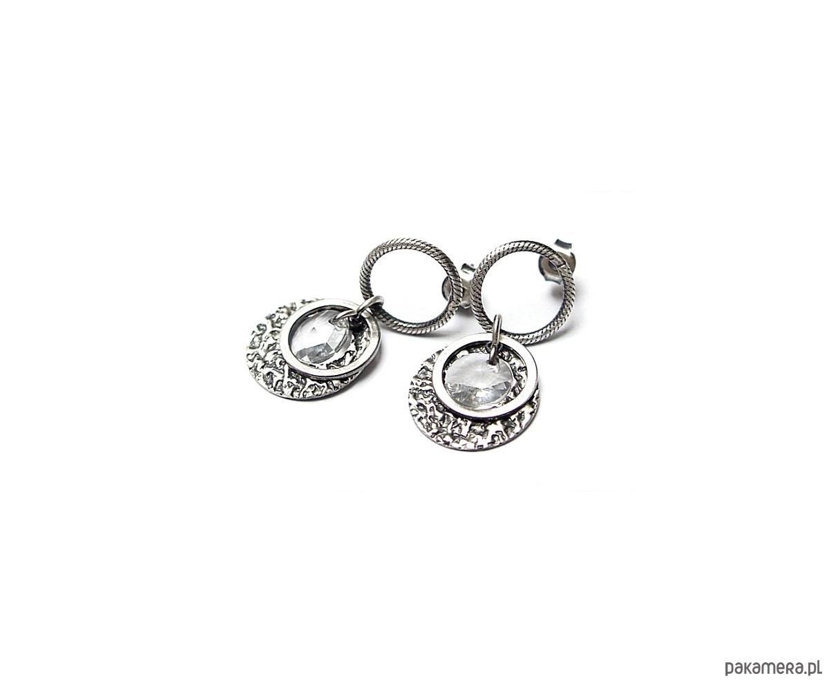 Kolczyki wykonane ze srebra [pr. 925 ] w połączeniu z kryształkami Swarovski [8mm] oraz srebrnymi blaszkami . Srebro oksydowane i przetarte. Całkowita długość kolczyków około 3cm. Biżuteria ozdobnie zapakowana.