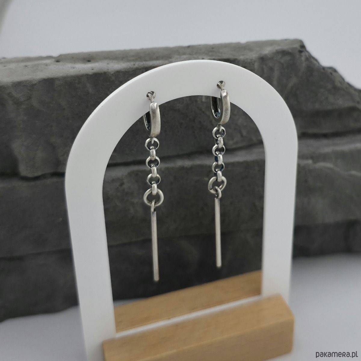 Minimalistyczne, nowoczesne kolczyki na co dzień. Wykonane w całości z oksydowanego srebra próby 925. Zapięcia typu kajdanki, zatrzaskowe. Całkowita długość kolczyków to ok. 6 cm. Na życzenie moge je wydłużyć lub wykonać w wersji nieoksydowane, a także zmienic zapięciana inne. Ozdobnie zapakowane.