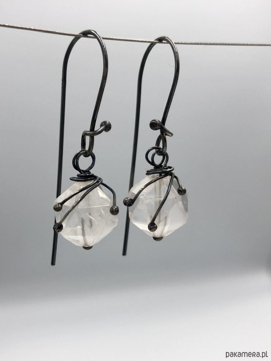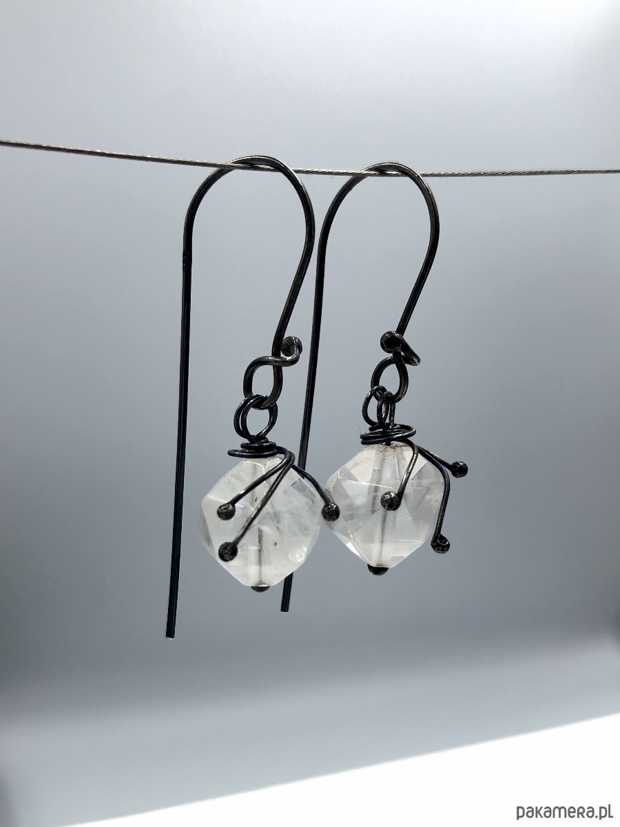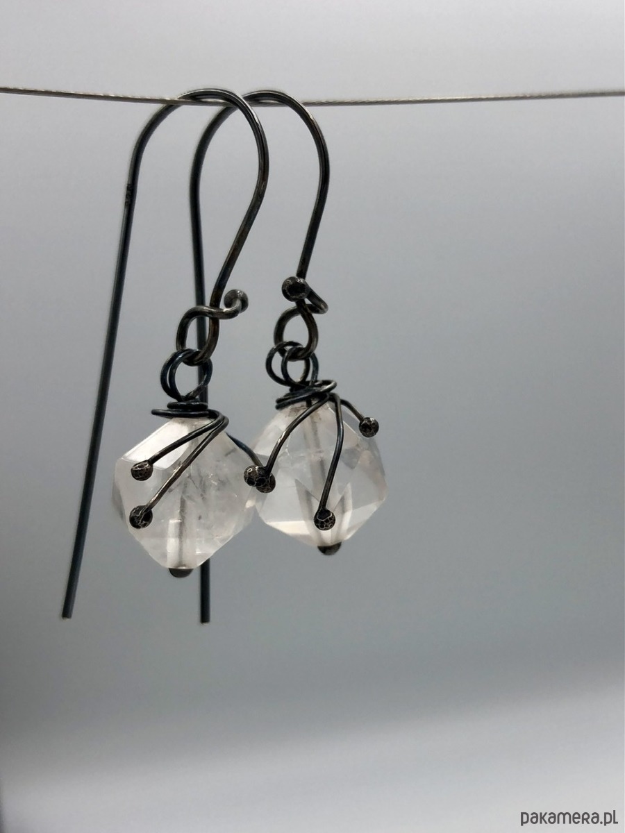Kolczyki wykonane z oksydowanego srebra i naturalnego kamienia - kwarcu o delikatnym różowym odcieniu.