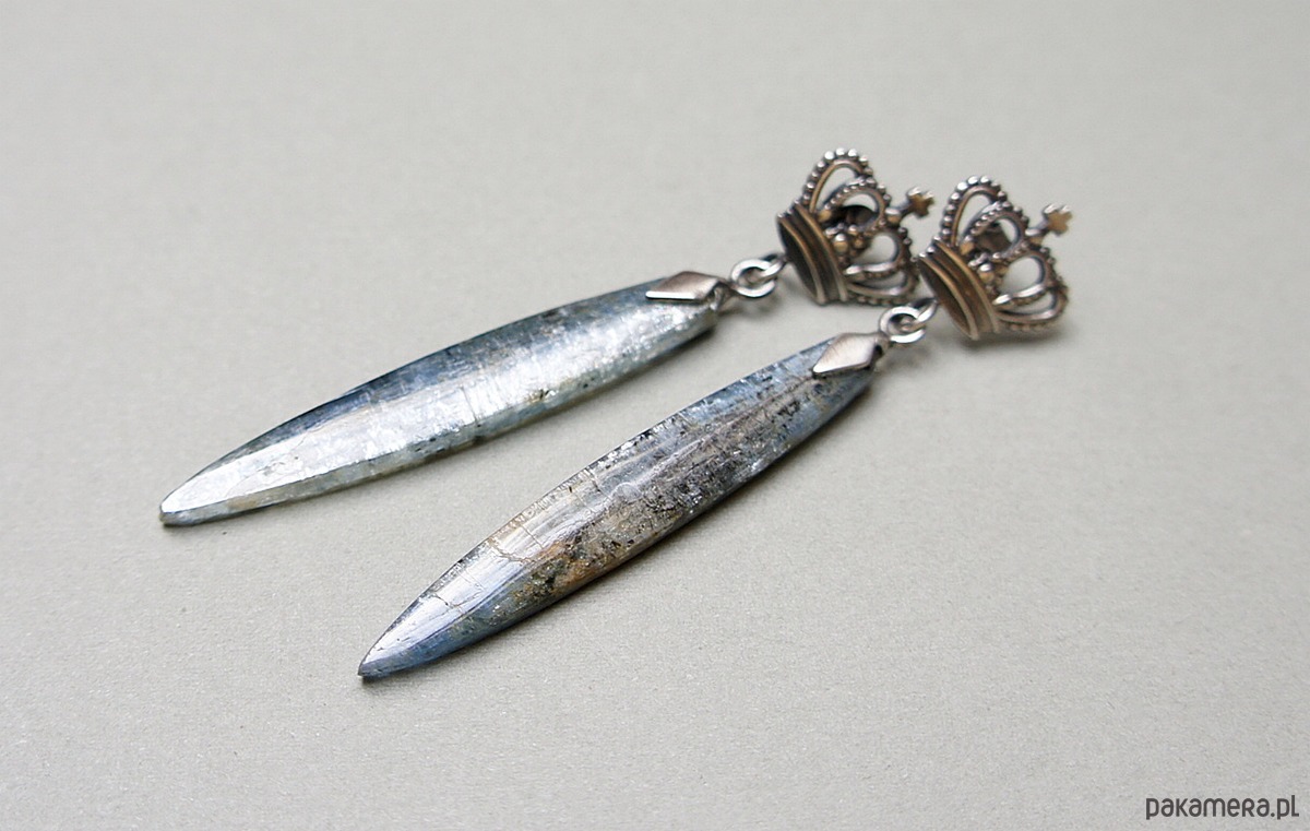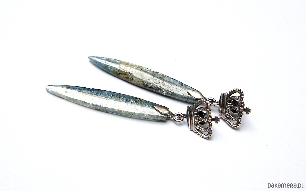 Kolczyki wykonane ze srebra [pr. 925] w połączeniu z markizami długich kyanitów [45mm]. Srebro oksydowane i przetarte. Całkowita długość kolczyków 6,8cm. Biżuteria ozdobnie zapakowana.