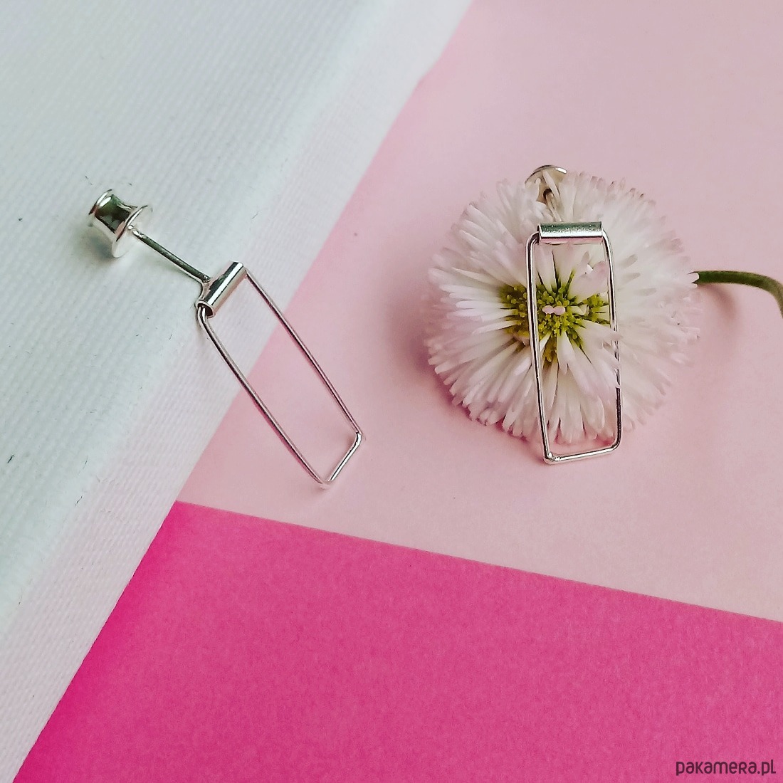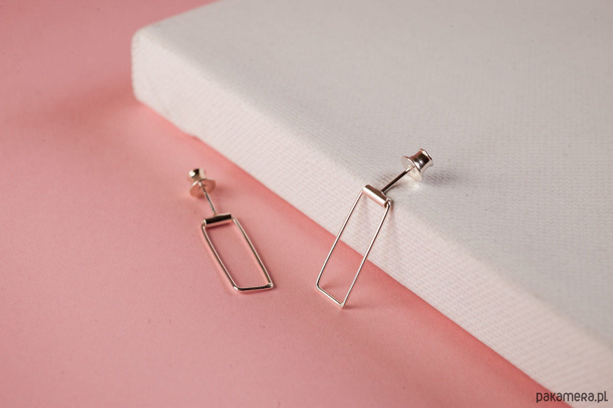 Kolczyki w kształcie prostokątów delikatnie poruszają się w uchu, subtelnie odbjając światło.