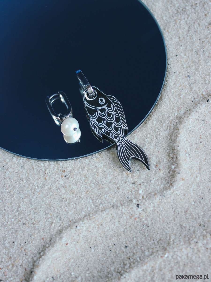 To para nie do pary:) Jeden kolczyk ma zawieszkę z rybką, drugi nieregularną perłę.