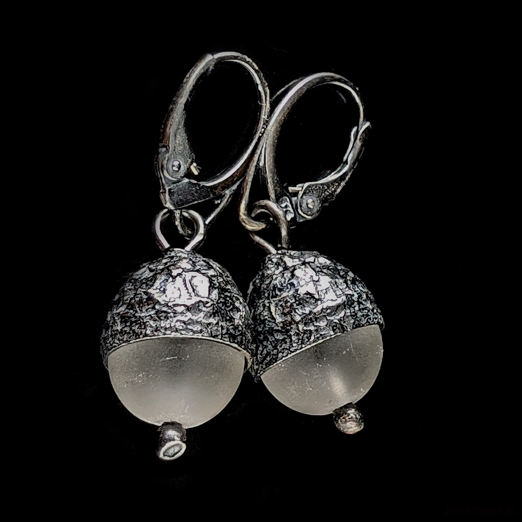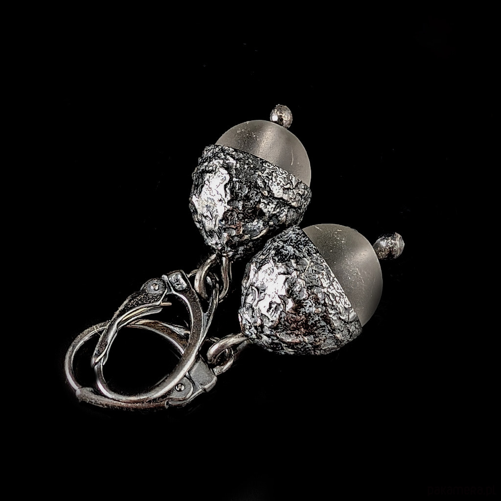 Kolczyki wykonane ze srebra próby 925 oraz pięknych kwarców satynowych. Kamienie transparentne, z mleczną, matową taflą. Czapeczki dębowe wykonane z oksydowanego srebra.