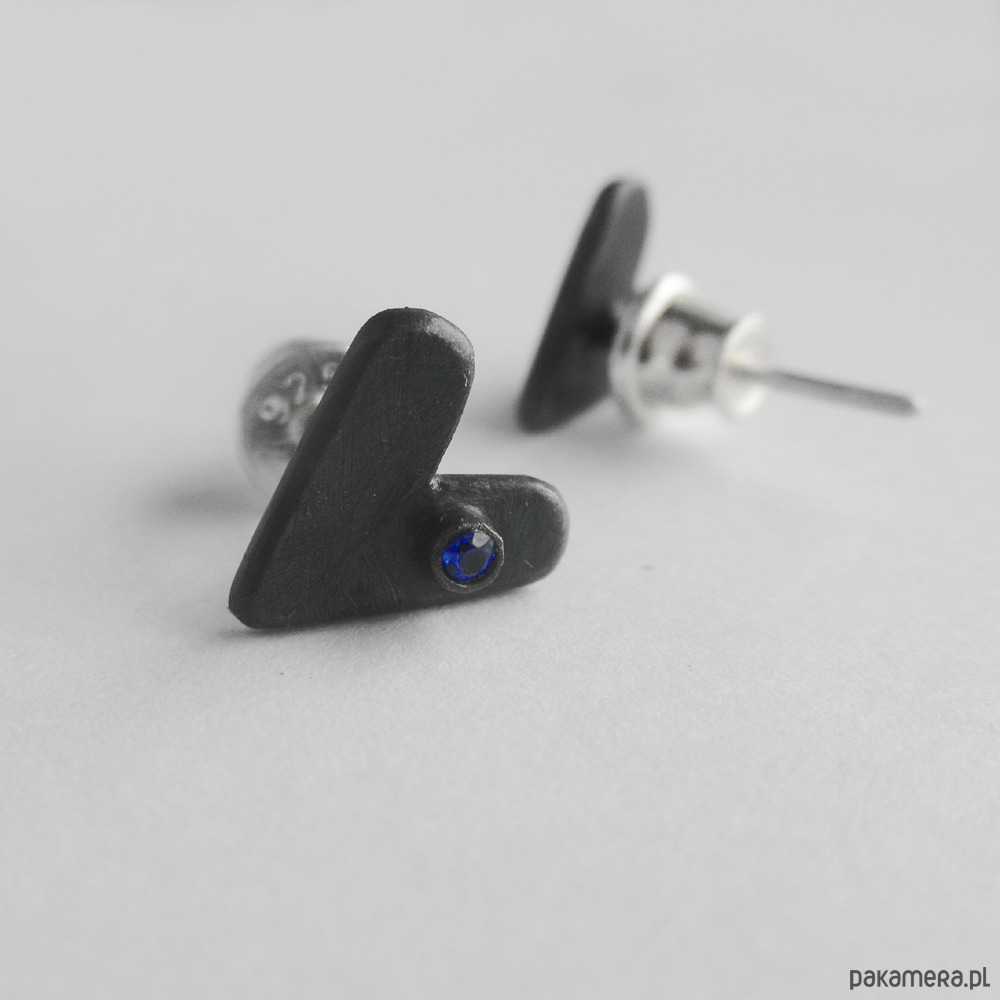 Kolczyki na sztyftach wykonane są ze srebra, cyrkonia . Srebro - próby 0,925, zmatowione, oksydowane. Długość 0,8 Szerokość 0.7 cm.