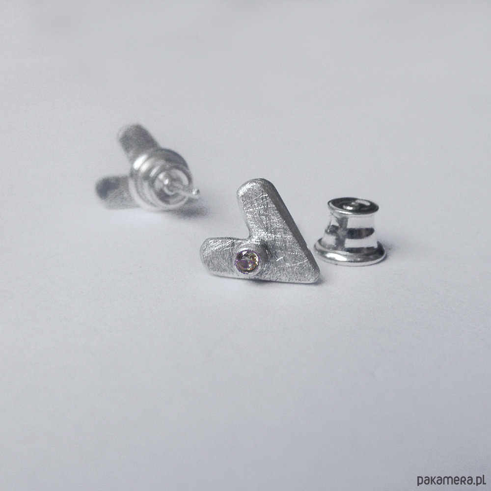 Kolczyki na sztyftach wykonane są ze srebra, cyrkonia . Srebro - próby 0,925, zmatowione Długość 0,8 Szerokość 0.7 cm.