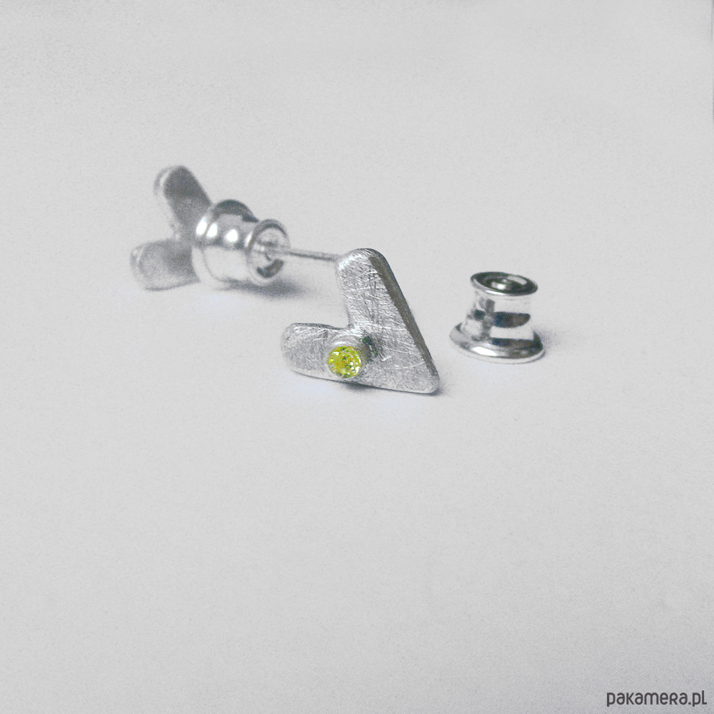Kolczyki na sztyftach wykonane są ze srebra, cyrkonia . Srebro - próby 0,925, zmatowione Długość 0,8 Szerokość 0.7 cm.