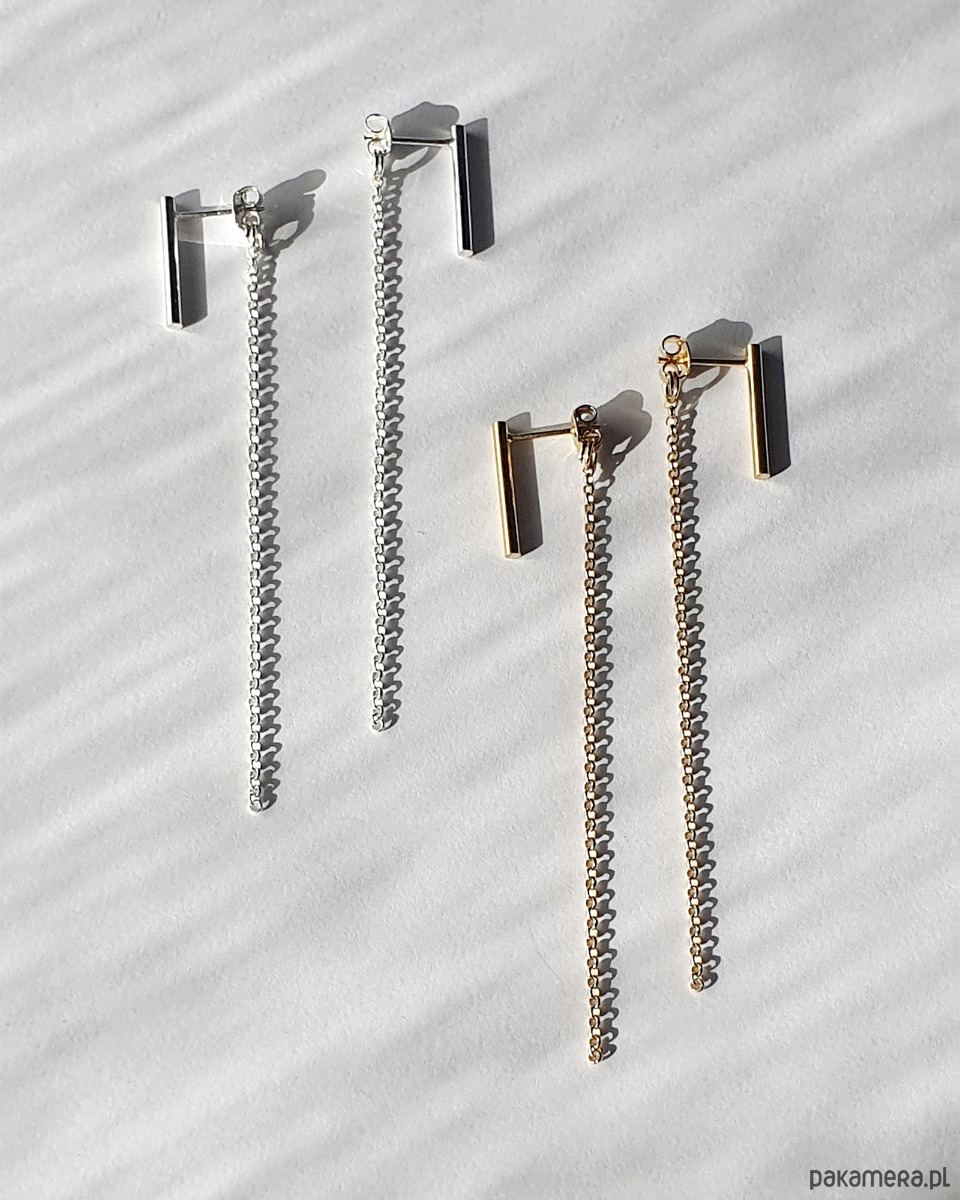 W tych kolczykach kochamy ich uniwersalność! Możesz je nosić na 3 sposoby: jako pojedyncze kreseczki, z ozdobnymi chwostami z tyłu lub asymetrycznie! Kolczyki są sprzedawane z dwoma rodzajami zapięć: baranki i baranki z łańcuszkami.