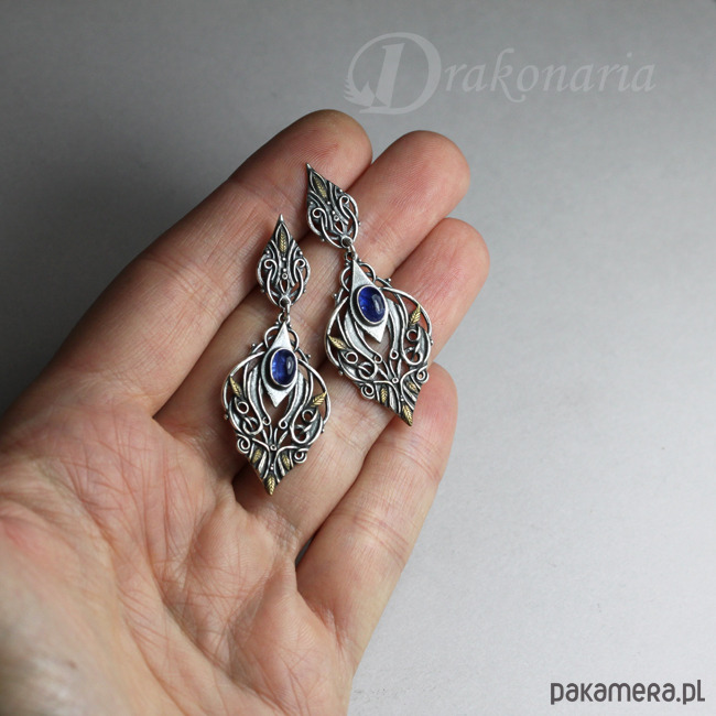 Sindarin to jeden z języków elfów, stworzonych przez J.R.R. Tolkiena. Język ten stał się inspiracją dla kolekcji, której kolejną odsłonę stanowią kolczyki Narn, co w języku Sindarin oznacza "opowieść" lub "saga". Kolczyki są ażurowe, wykonane przeze mnie ze srebra, ozdobione maleńkimi ornamentami, głęboko niebieskimi kyanitami i pozłocone miejscowo żółtym złotem.