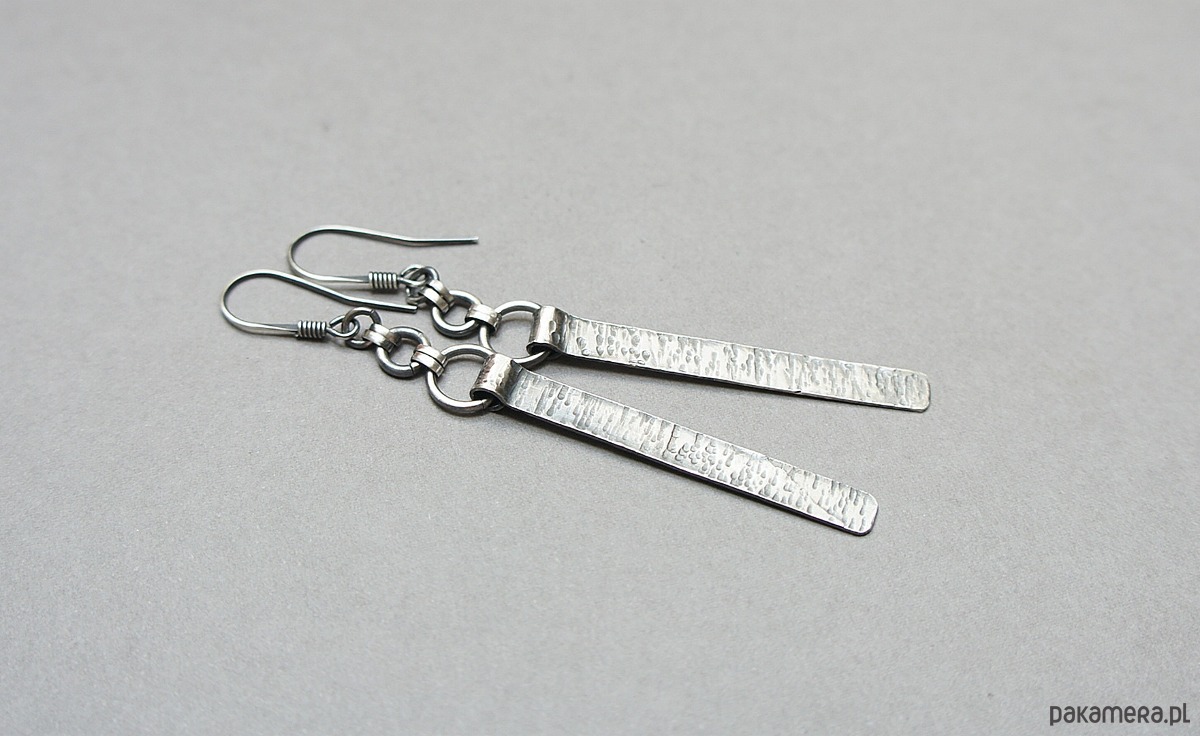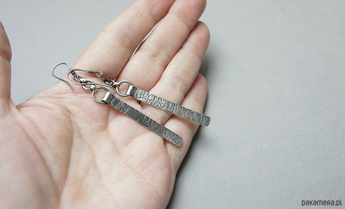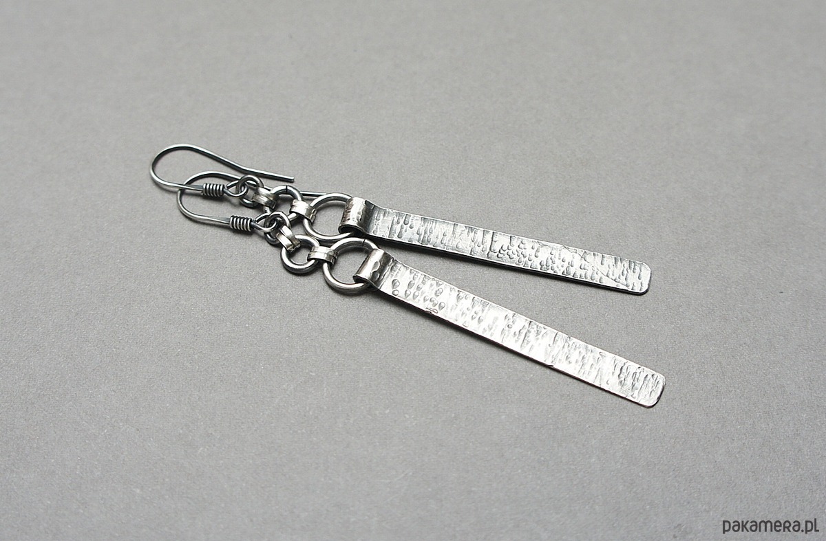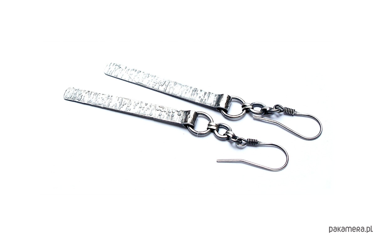 Kolczyki wykonane własnoręcznie od podstaw w całości ze srebra [pr. 925]. Wielkość młotkowanych blaszek [4,2cm]. Całość oksydowana i przetarta. Całkowita długość kolczyków 7,5. Biżuteria ozdobnie zapakowana .