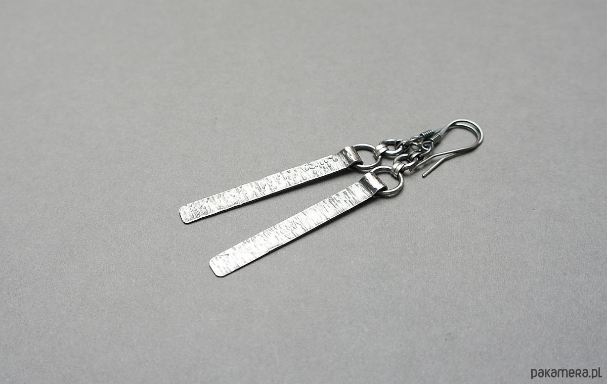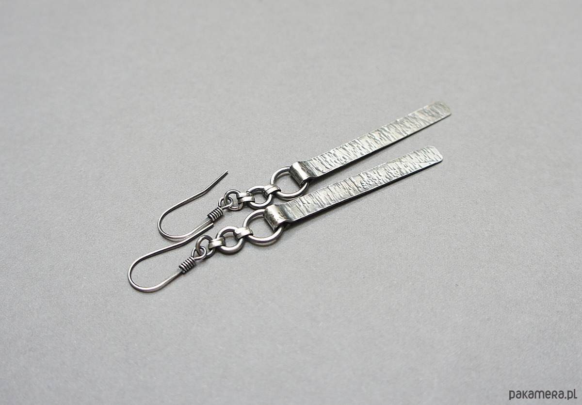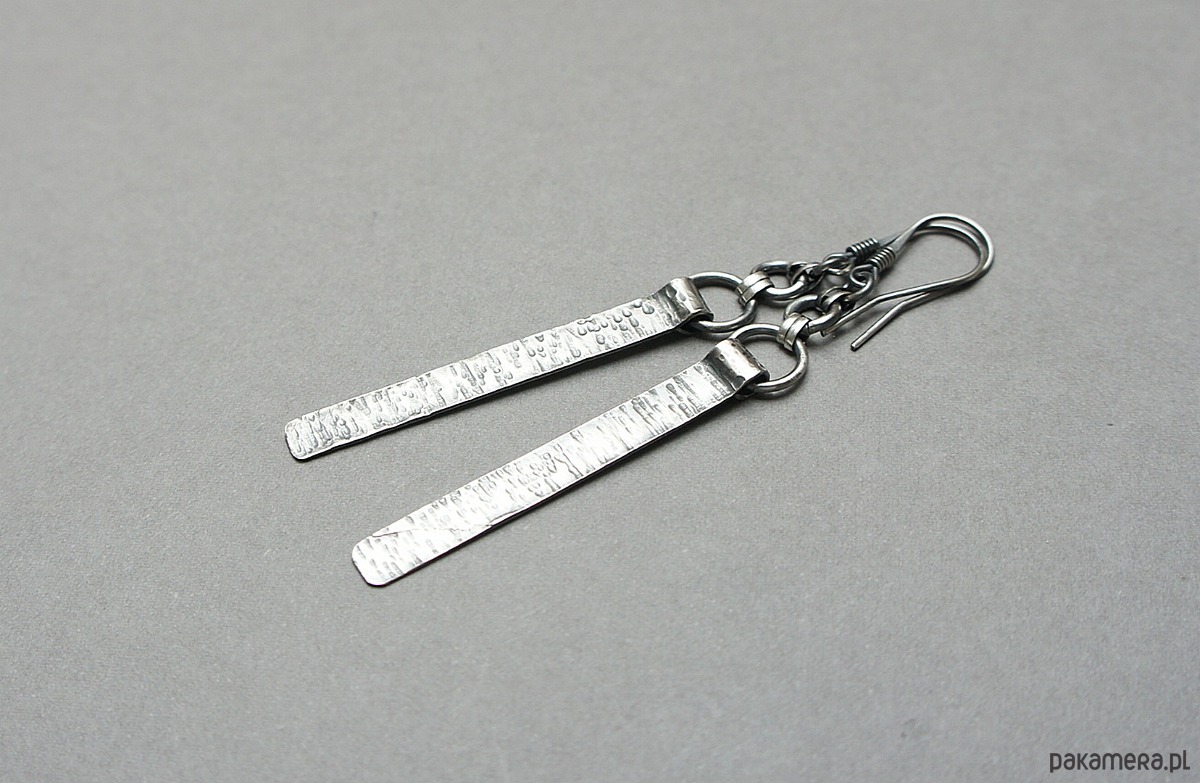 Kolczyki wykonane własnoręcznie od podstaw w całości ze srebra [pr. 925]. Wielkość młotkowanych blaszek [4,2cm]. Całość oksydowana i przetarta. Całkowita długość kolczyków 7,5. Biżuteria ozdobnie zapakowana .