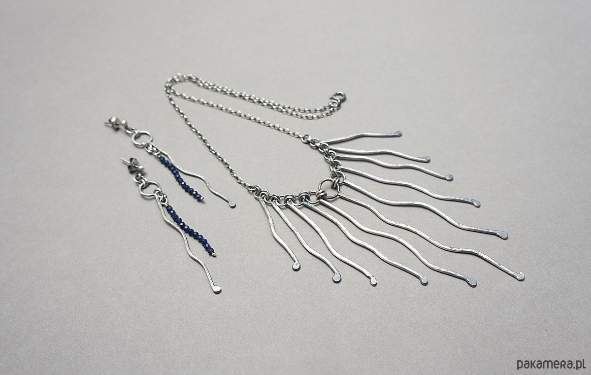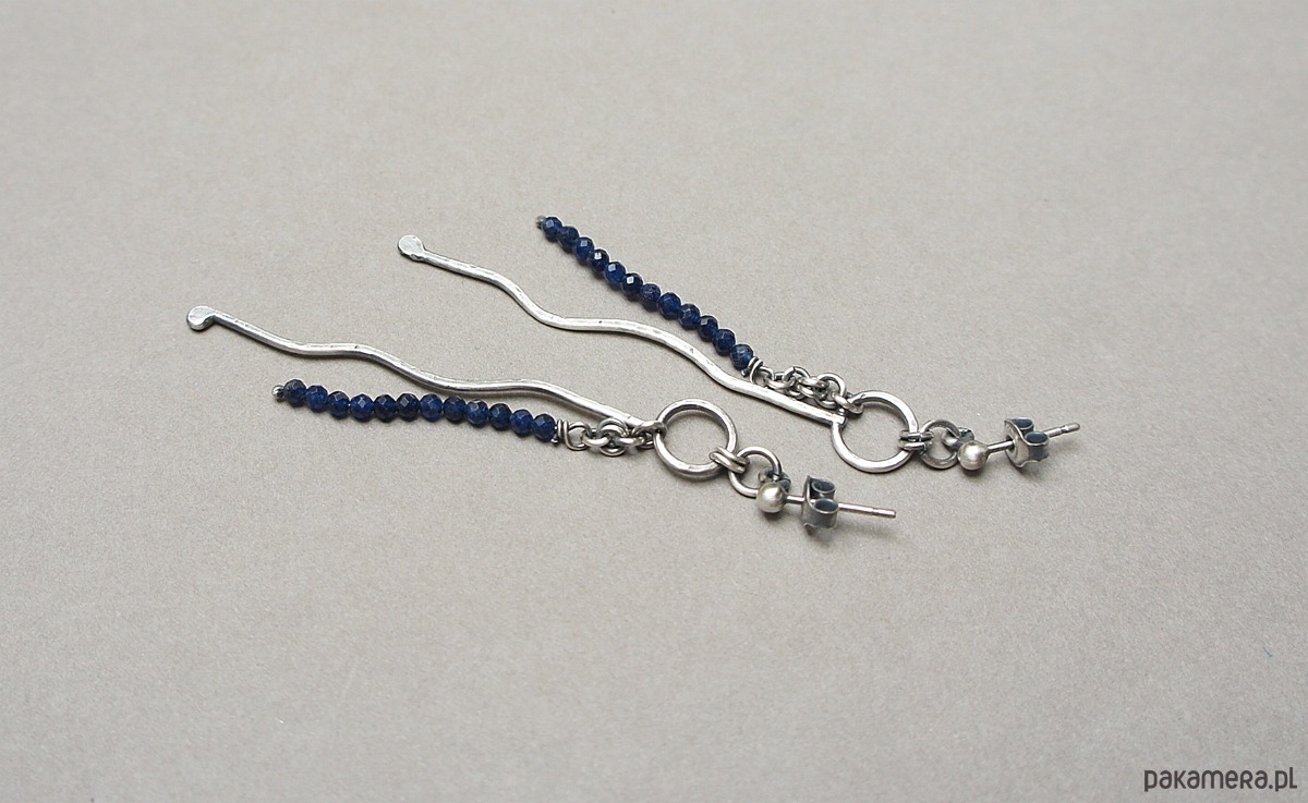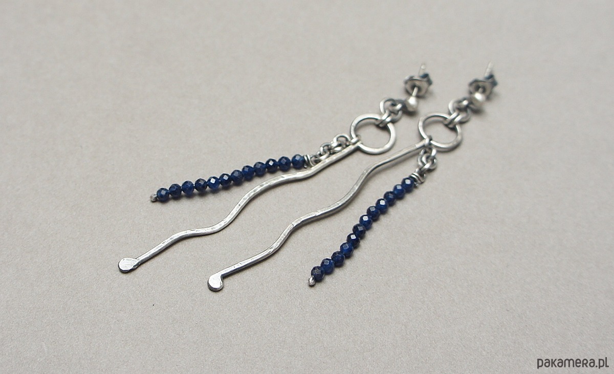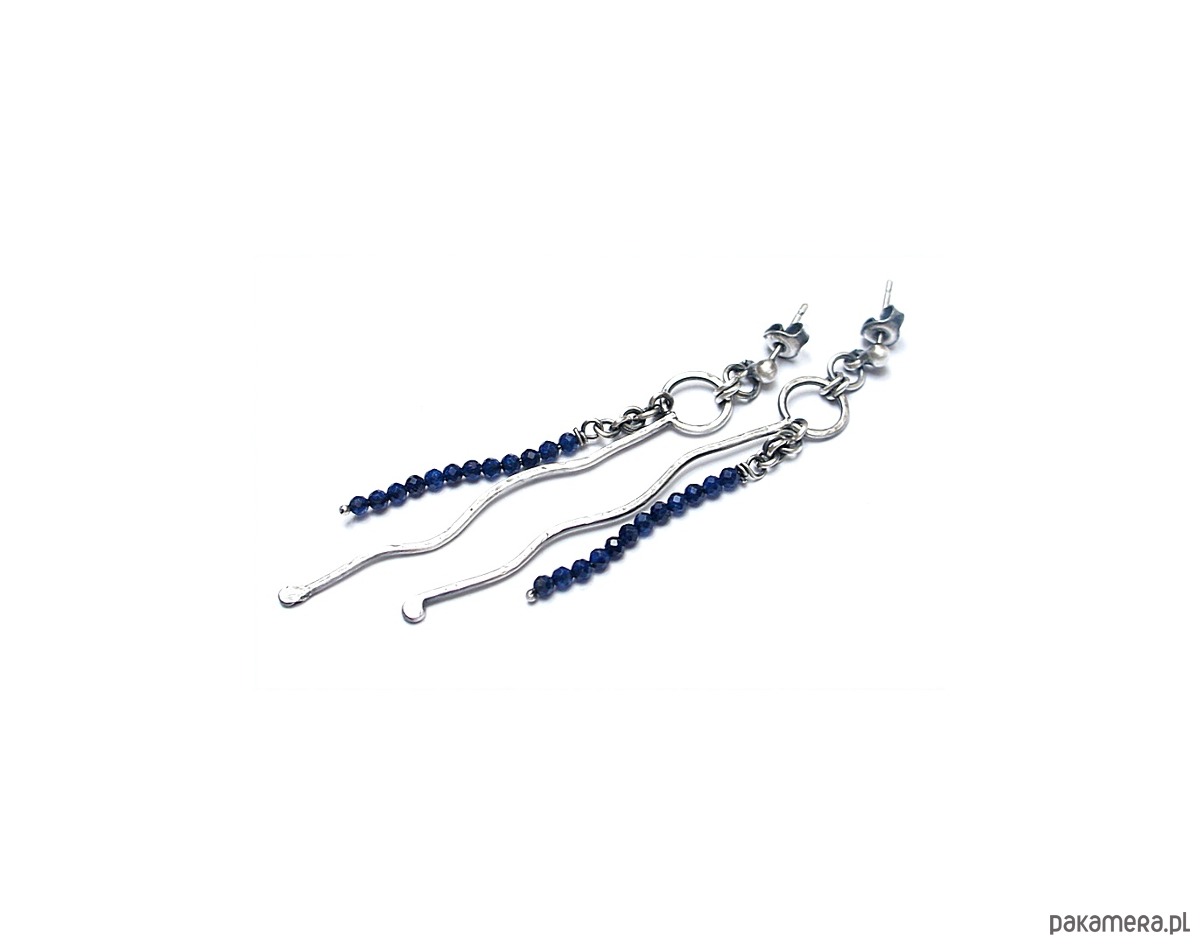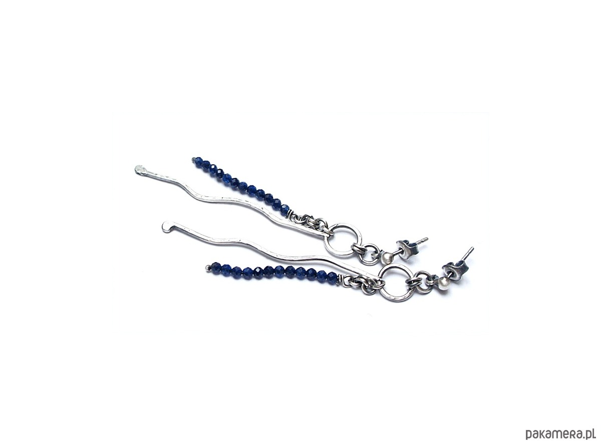 Kolczyki wykonane własnoręcznie od podstaw ze srebrnego drutu [pr.925 ,śr.1,2mm] w połączeniu fasetowanymi kuleczkami szafirów [ 2mm- syntetyczne]. Srebro oksydowane i przetarte. Całkowita długość kolczyków około 7cm. Biżuteria ozdobnie zapakowana.