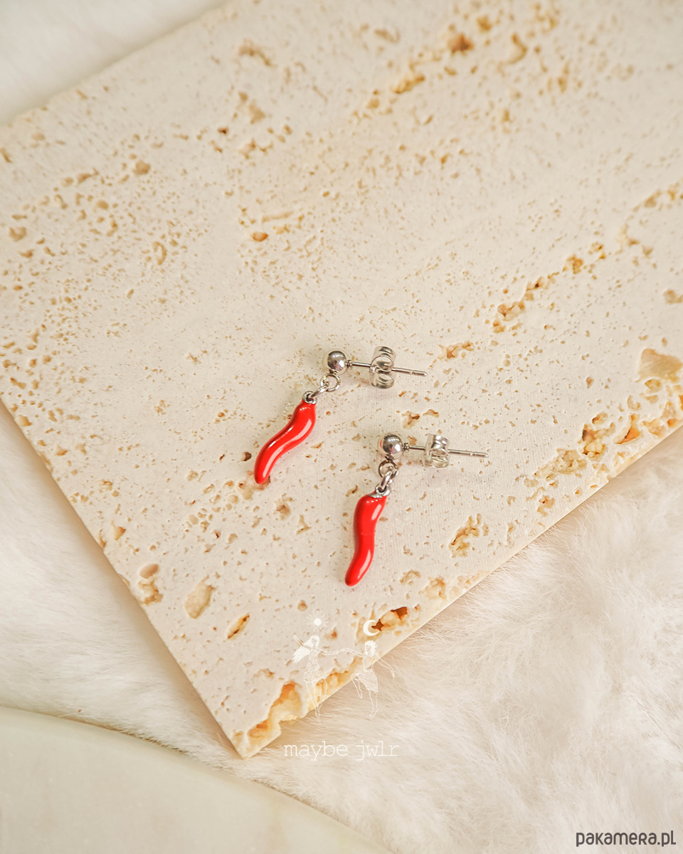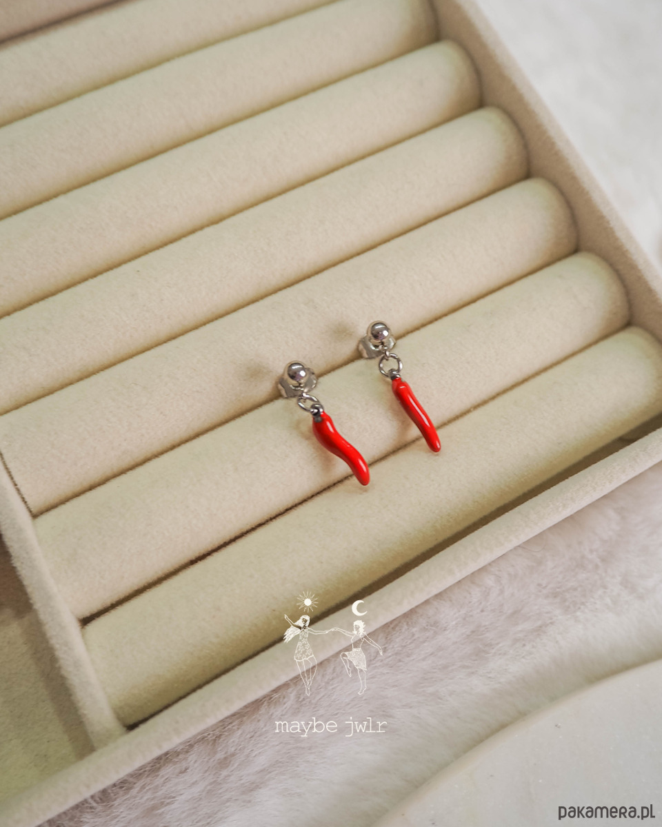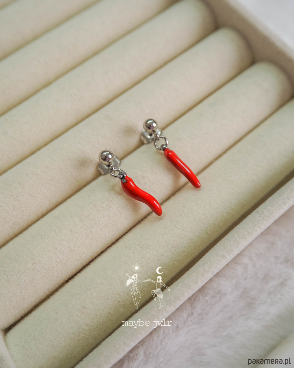 Kolczyki z kuleczką i srebrnymi zawieszkami papryczki chilli, są pokryte czerwoną emalią.