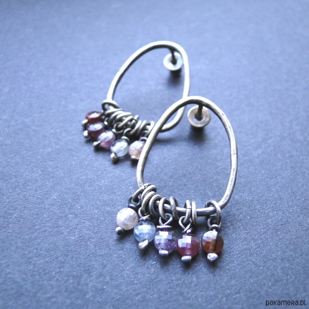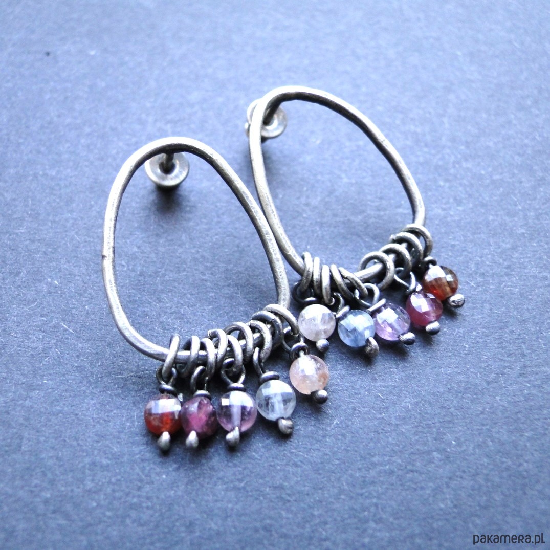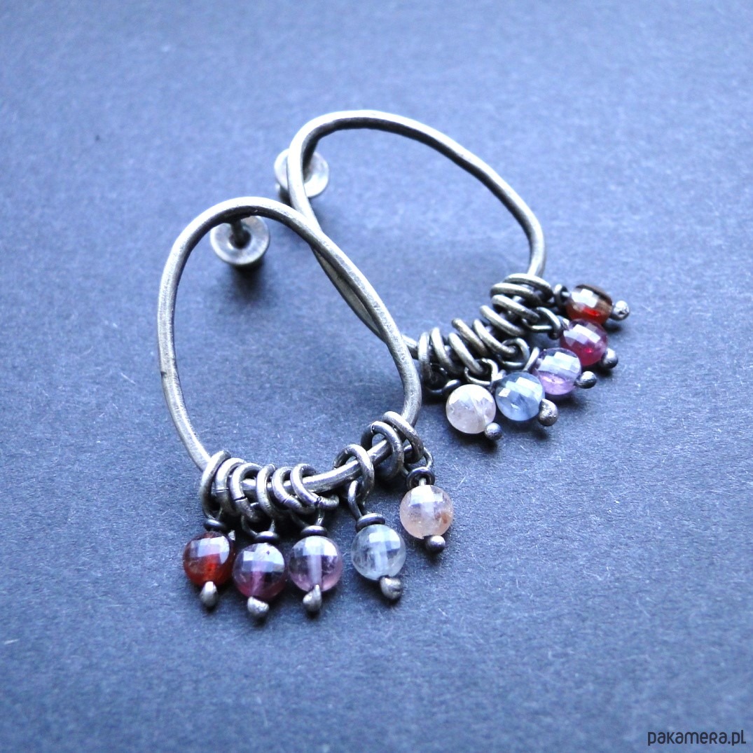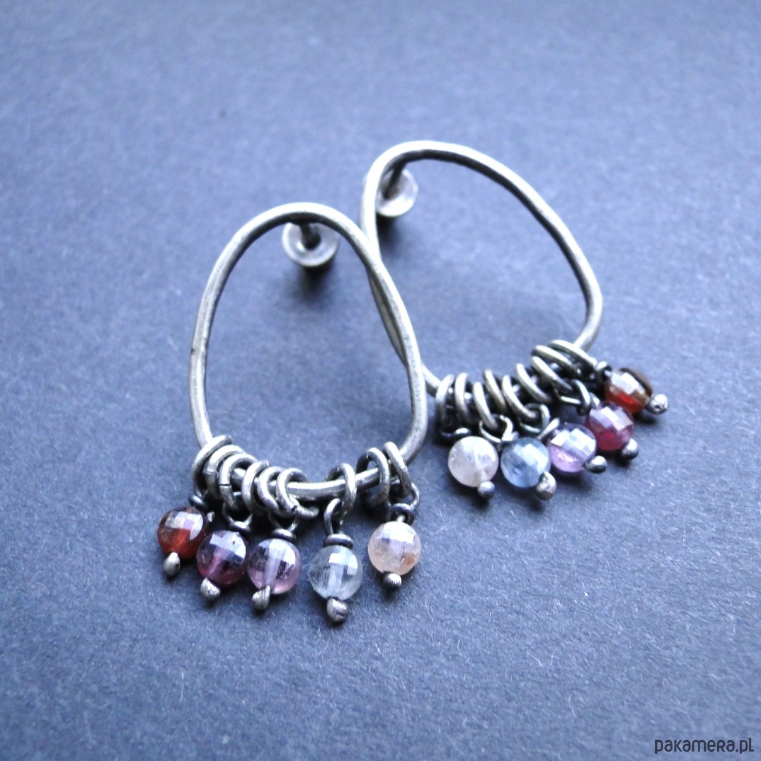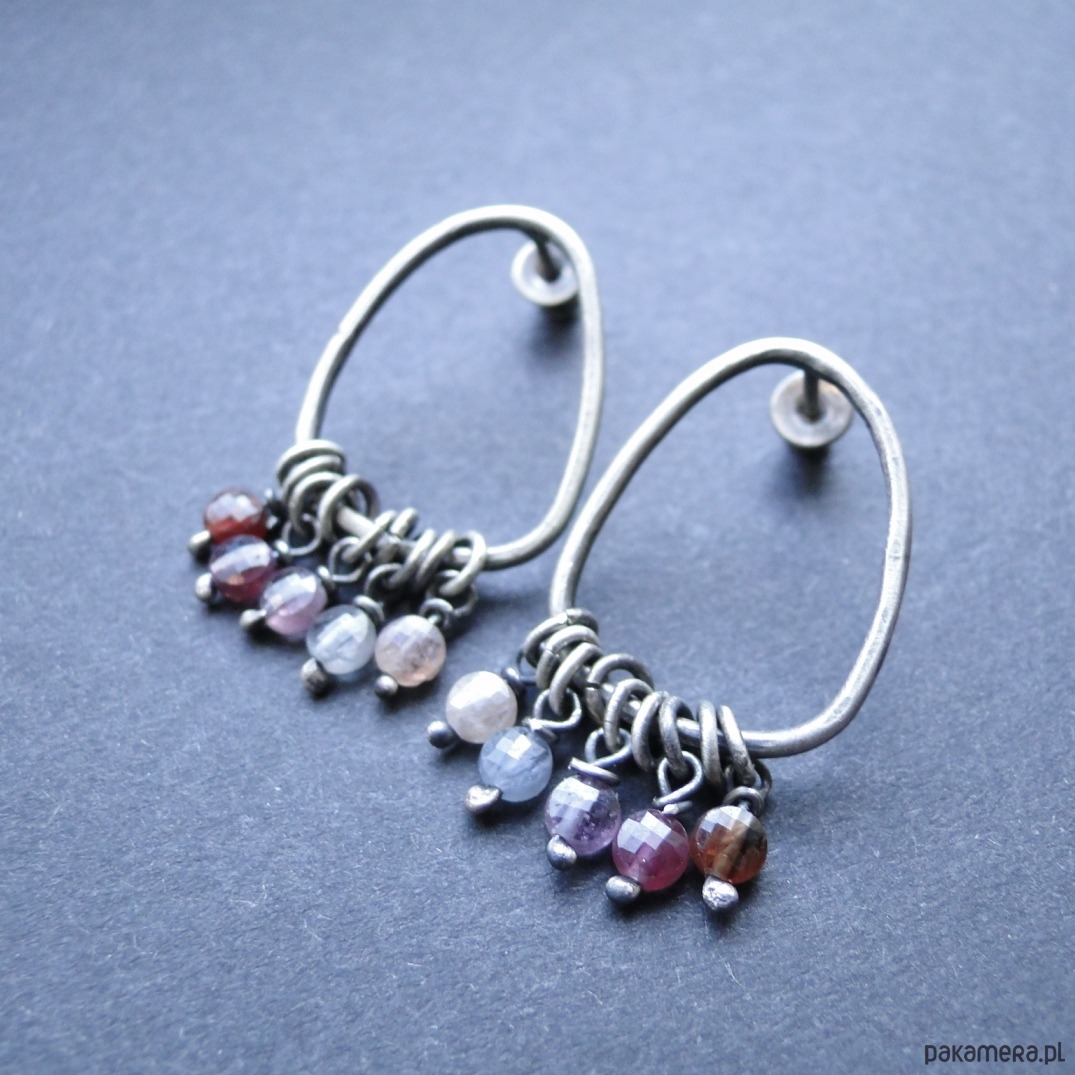Surowe kolczyki typu sztyfty w najmodniejszym kształcie. Minimalizm w pastelowych odcieniach. Srebro 925,oksydowane i szorowane. Kamienie: unikatowy kolorowy spinel śr.4 mm w ciekawych kolorach. Sztyfty nieregularne, ręcznie wykonane. Wielkość kolczyków: 3,3 cm. Nie moczyć w wodzie. Zatyczki srebrne w silikonowym wewnątrz.