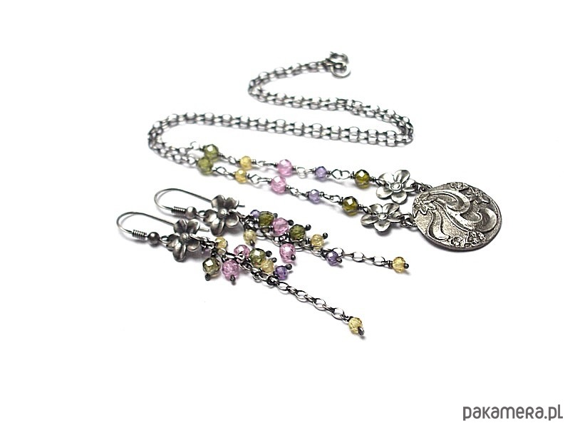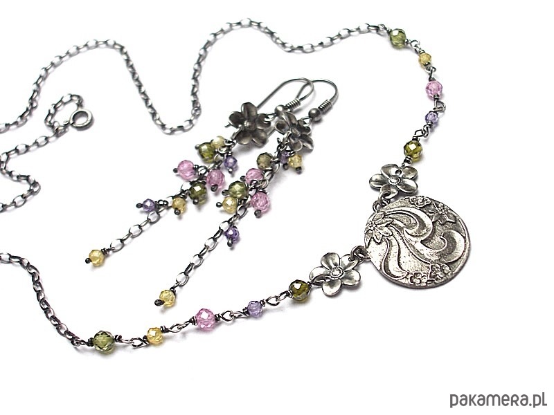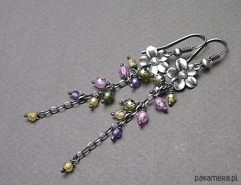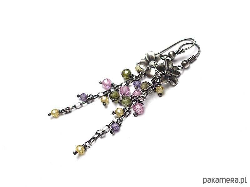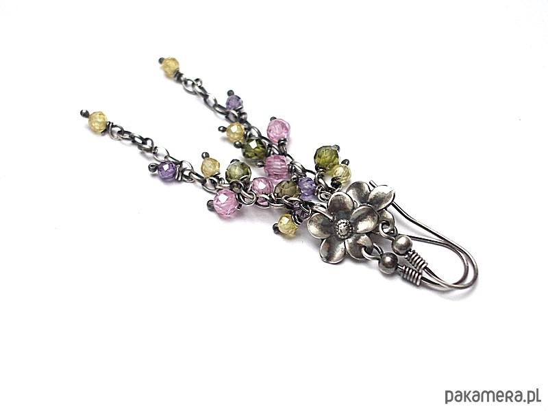 Kolczyki wykonane ze srebra [pr. 925] w połączeniu z kuleczkami cyrkonii [4mm i 3mm] oraz srebrnymi kwiatuszkami. Całkowita długość kolczyków: 7,3cm.