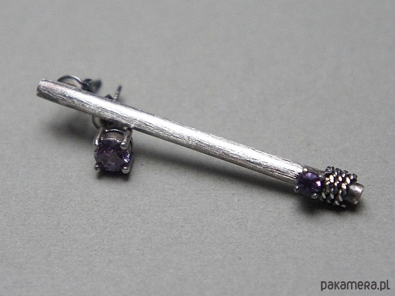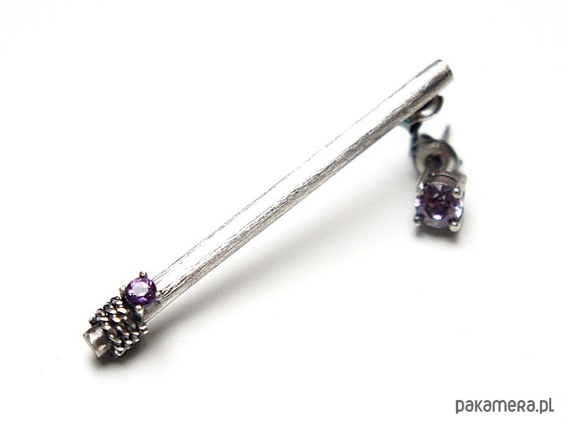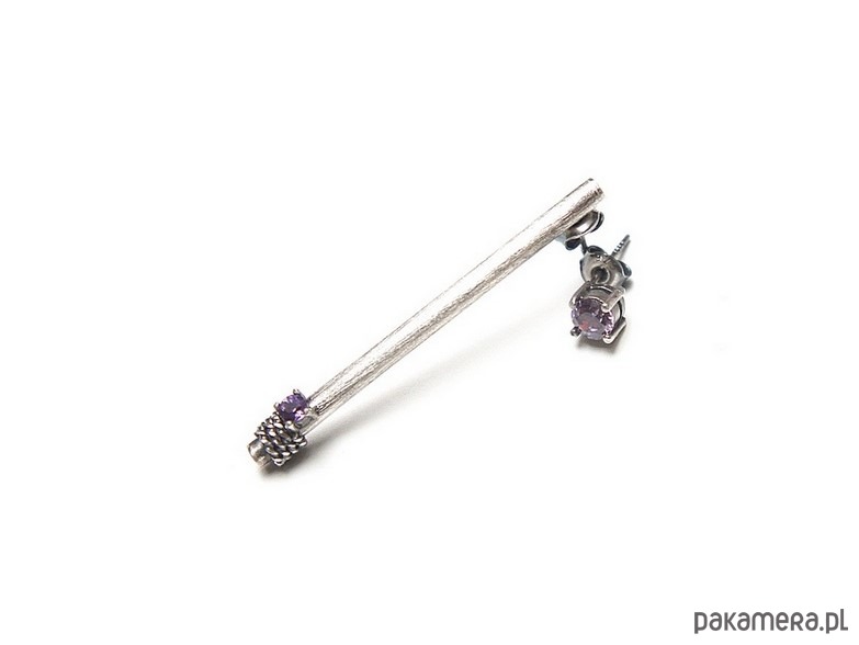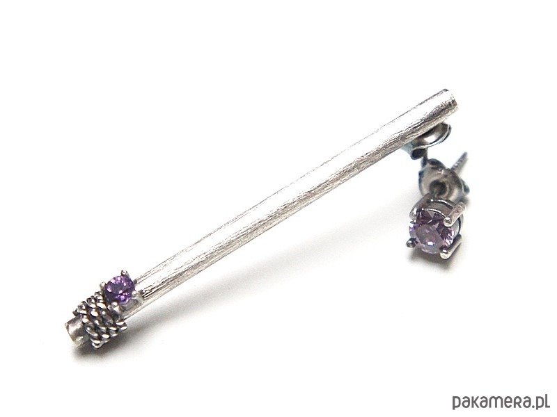 Asymetryczne kolczyki wykonane ręcznie od podstaw ze srebra [pr. 925] w połączeniu z cyrkoniami [3mm i 5mm]. Srebrna rurka satynowana [długość 5cm; śr 3mm]. Biżuteria ozdobnie zapakowana.