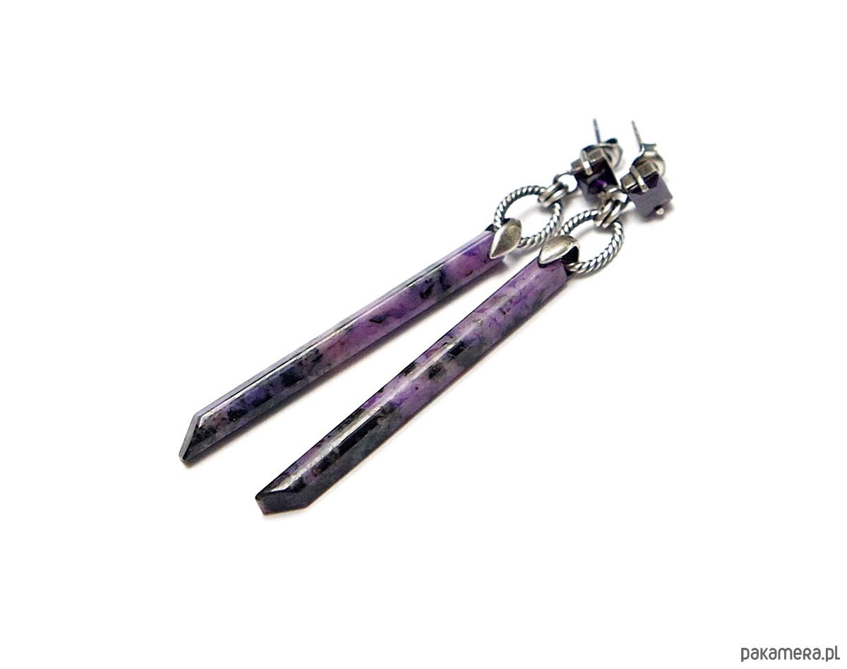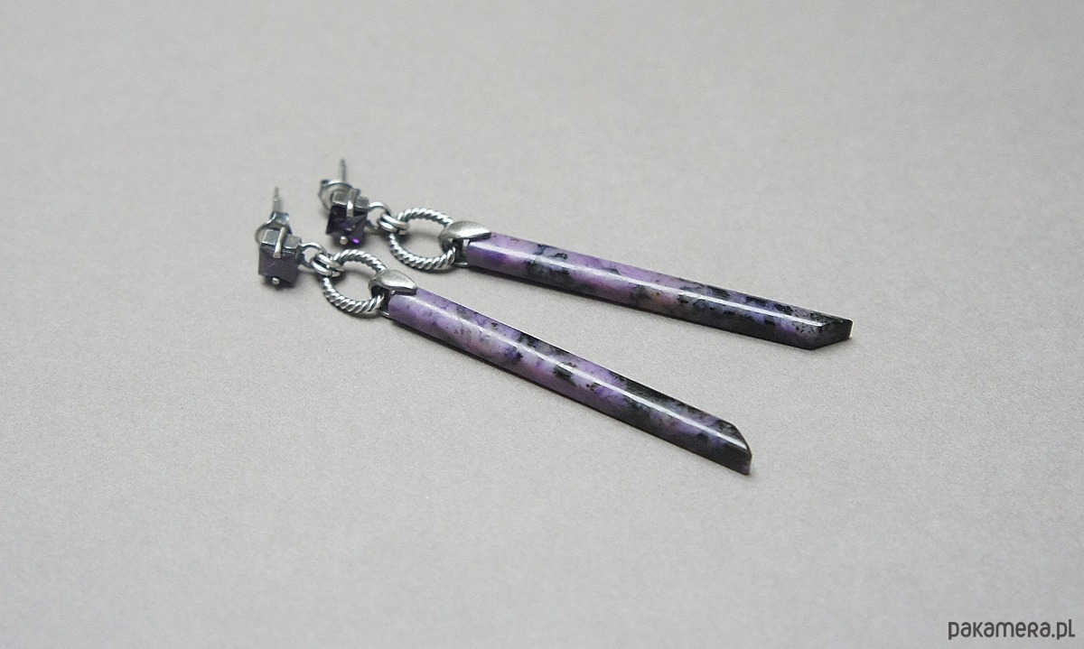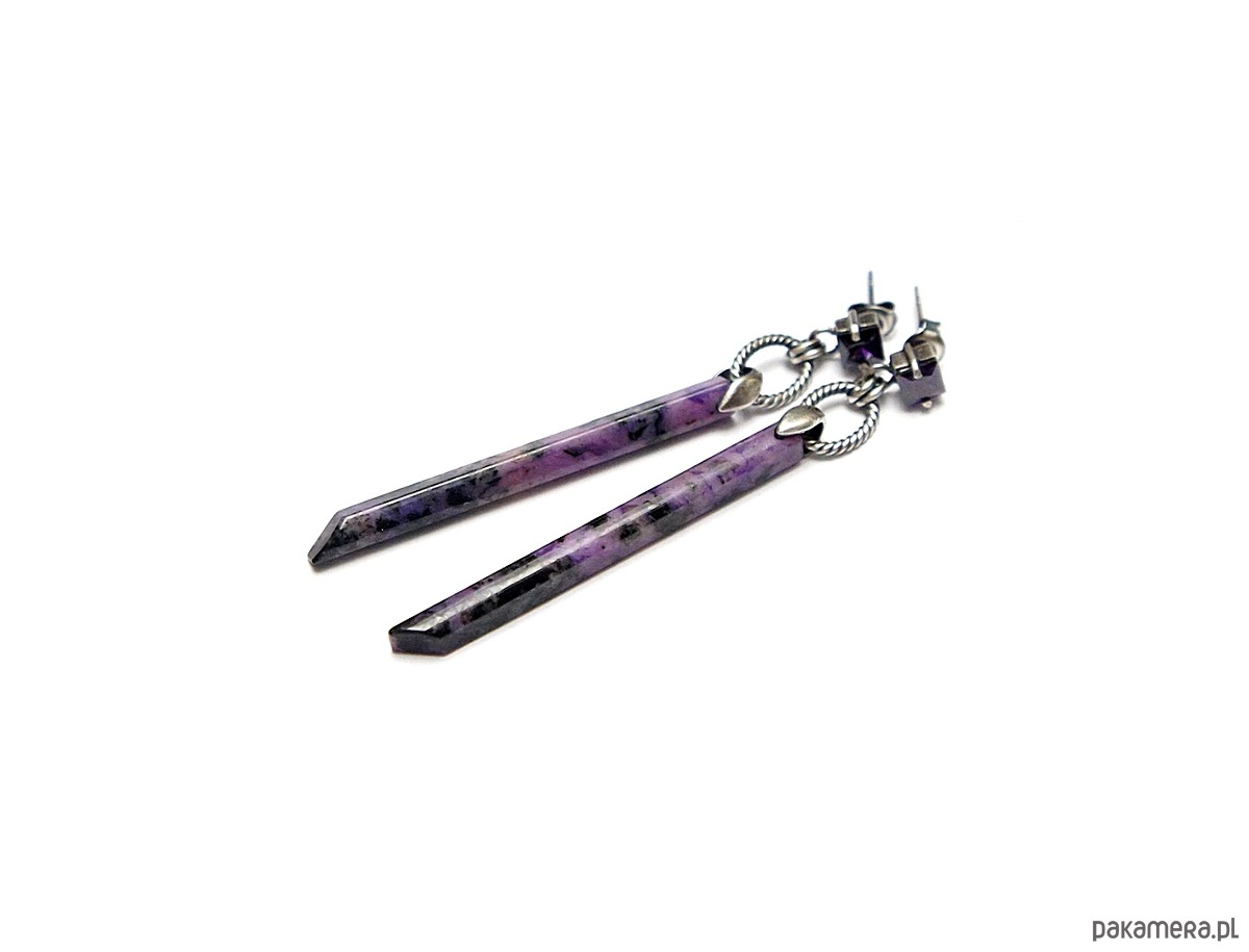 Kolczyki wykonane ręcznie ze srebra [pr. 925] w połączeniu z patyczkami czaroitów [50mm] oraz cyrkoniami [5mm]. Srebro oksydowane i przetarte. Całkowita długość kolczyków 7,3cm. Biżuteria ozdobnie zapakowana.