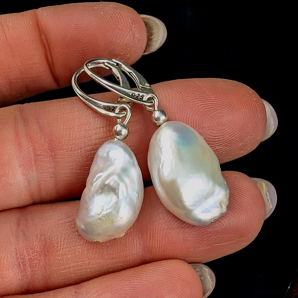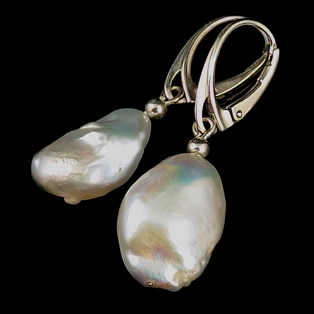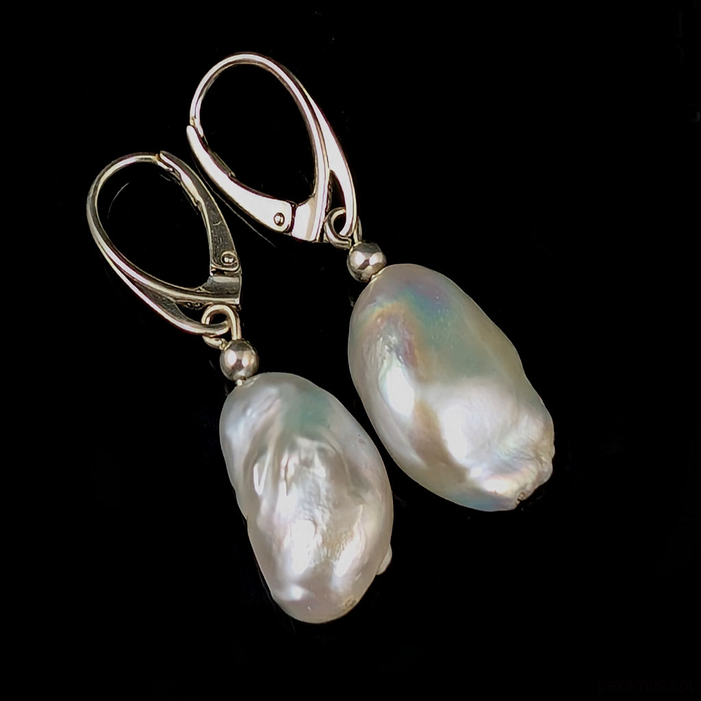 Subtelne kolczyki wykonane ze srebra próby 925 z w komponowanymi naturalnymi perłami. Ponadczasowa elegancja, klasyka z nutą awangardy. Wymiary pereł 19 x 13 mm, długość z biglami 37 mm. Kolczyki są lekkie i komfortowe w noszeniu pomimo swoich rozmiarów. Waga jednego kolczyka 3,6 grama. Kolczyki zostaną zapakowane w ozdobne pudełeczko.