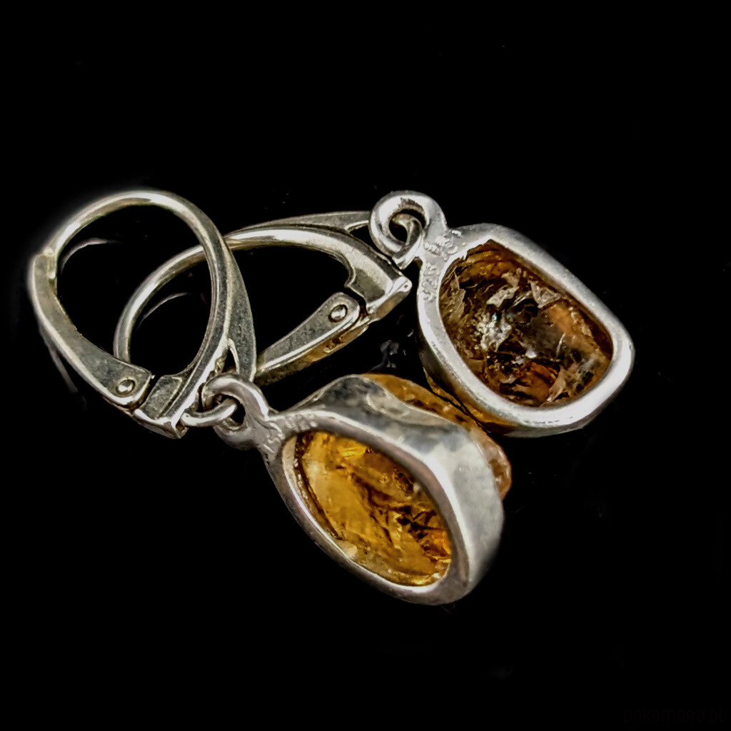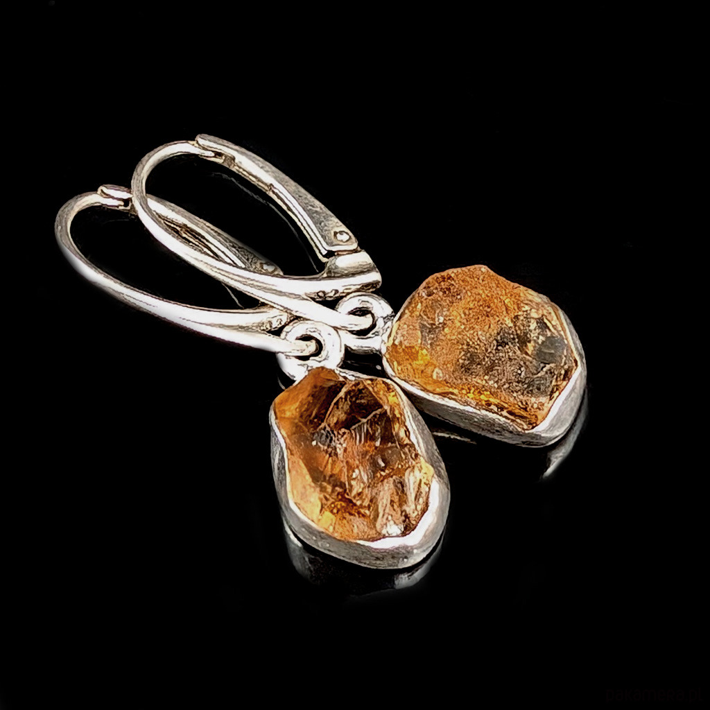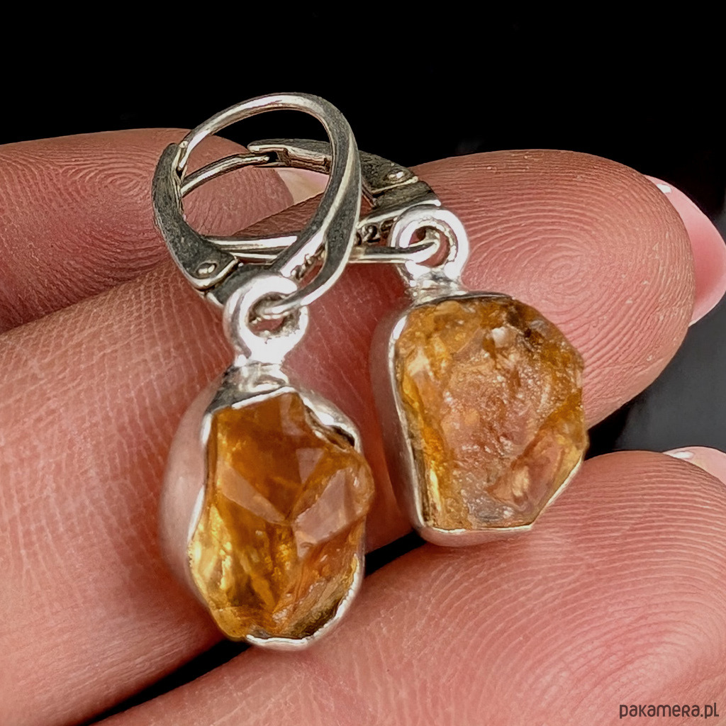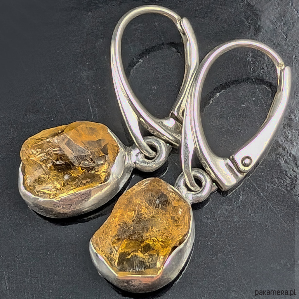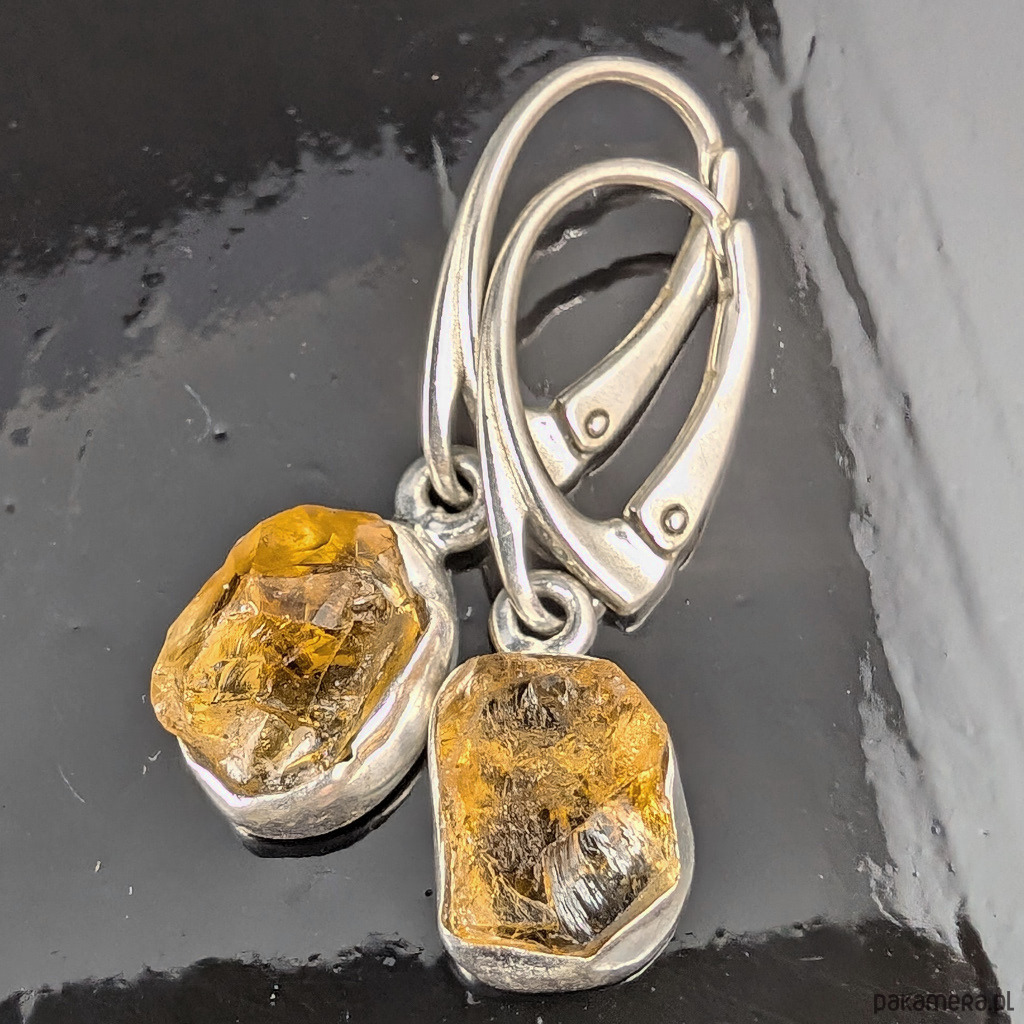 Surowe, okazałe kolczyki wykonane ze srebra 925 ora cytrynów. Wymiary elementów oprawy kamienia 12 x 9 mm. Zapinane na klasyczne bigle angielskie. Długość całości z biglami 31 mm. Leciutkie, waga jednego kolczyka 2,2 grama. Polecam, piękne, surowe bryłki.