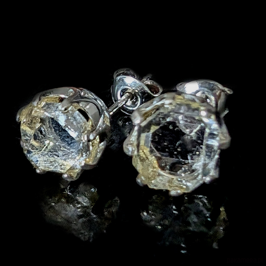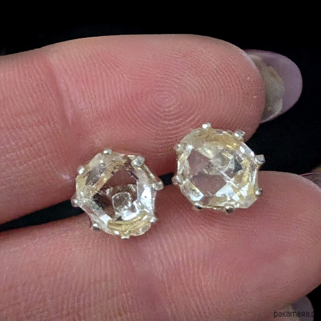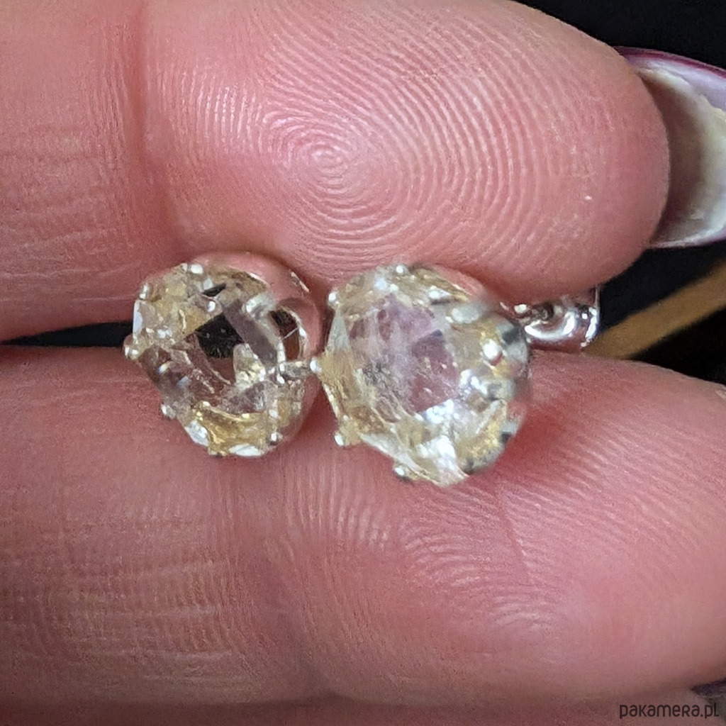 Surowe kolczyki wykonane ze srebra próby 925.W prostą cargę oprawione zostały surowe herkimery. Wymiary oprawy nieregularnych bryłek kryształu ok. 10 x 9 mm. Waga jednego kolczyka 1,23 g. Kolczyki zostaną zapakowane w ozdobne pudełeczko.