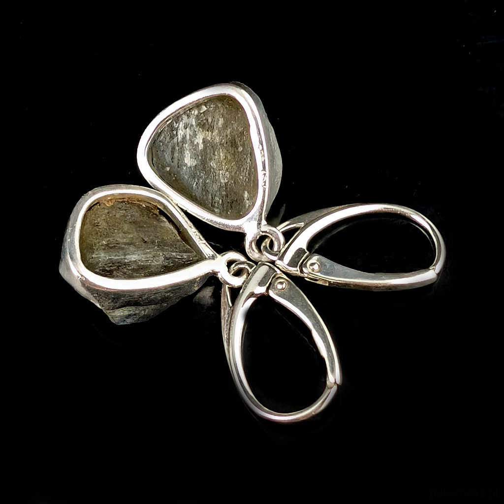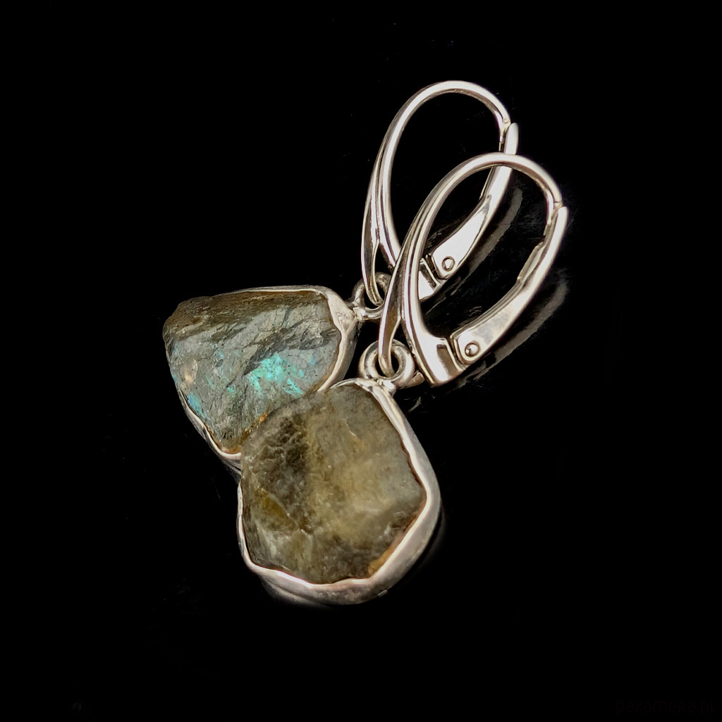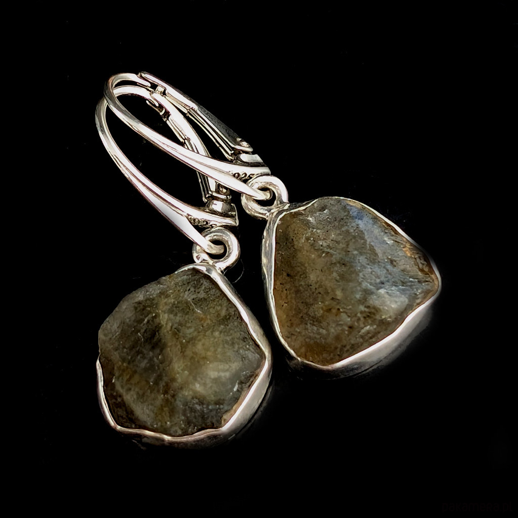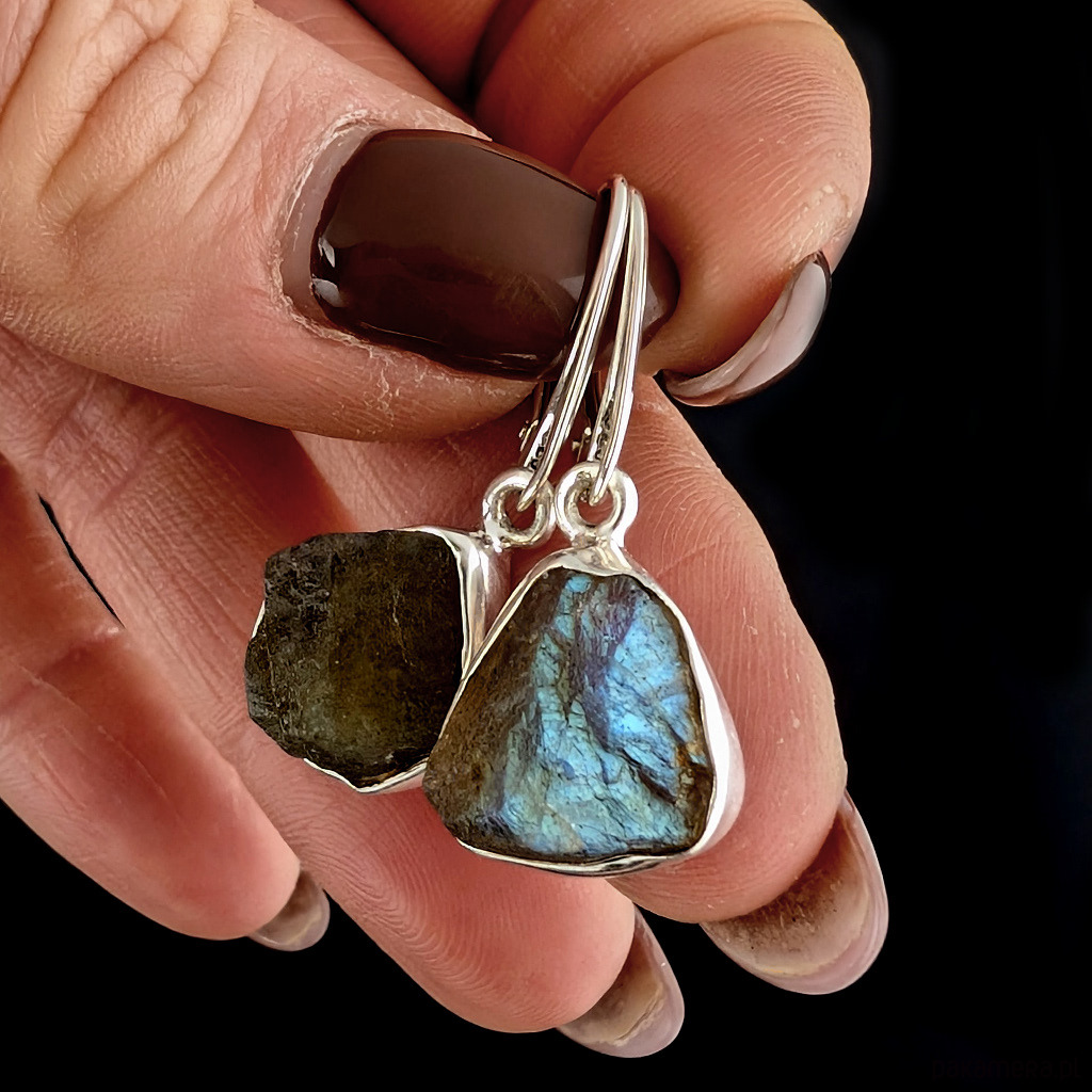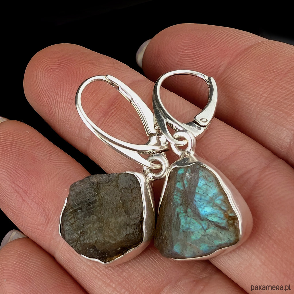 Kolczyki wykonane ze srebra próby 925 oraz naturalnych labradorytów o surowej tafli. Długość całkowita z biglami 33 mm. elementy mają 16 x 13 mm, piękna struktura kamieni. Waga jednego kolczyka 3,8 grama. Wykonane przez dostawcę kamieni.
