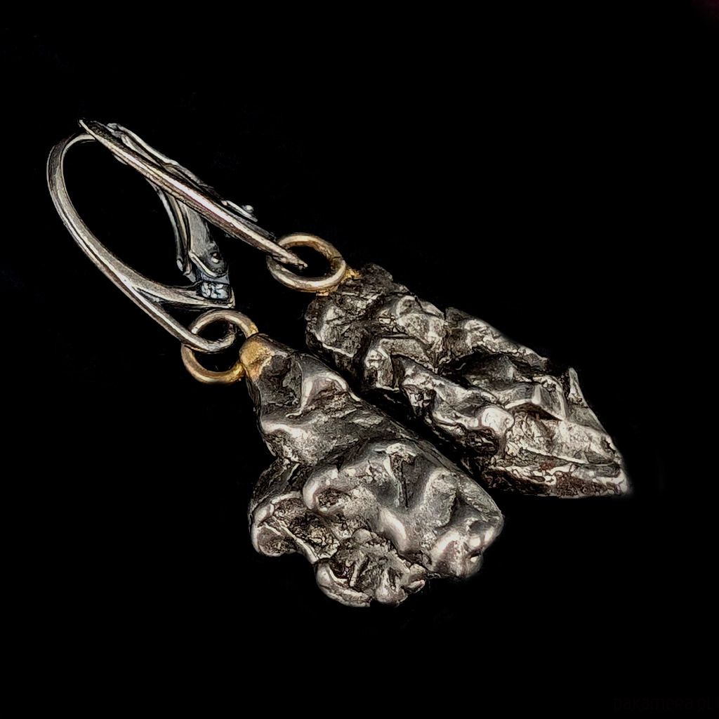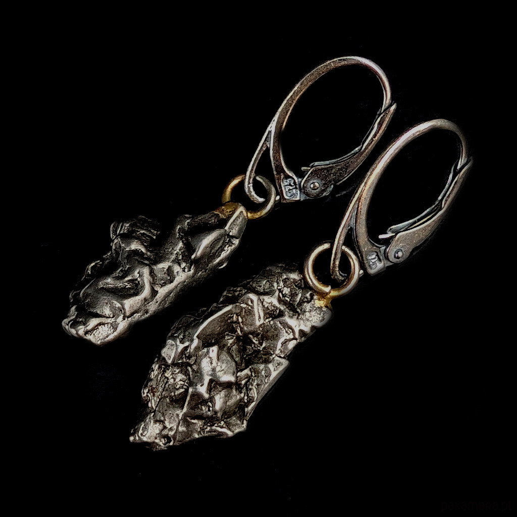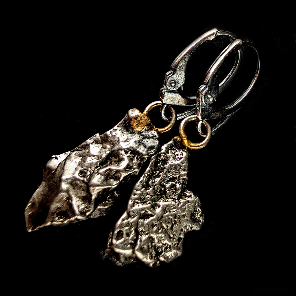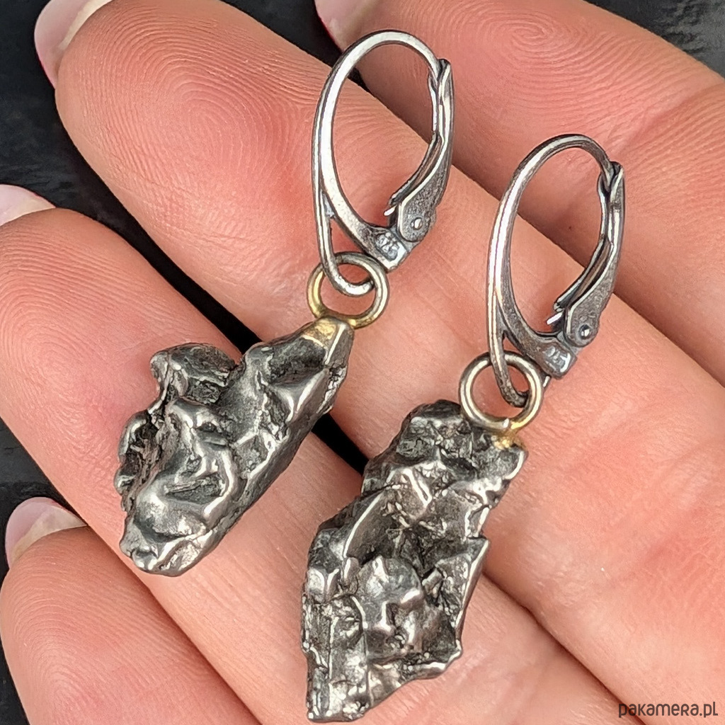 Kosmiczne kolczyki z meteorytami Campo Del Cielo (Argentyna) o kształcie nieregularnych bryłek na biglach angielskich z oksydowanego srebra próby 925. Wymiary elementów 20 x 10 mm. Długość z biglami angielskimi 37 mm. Lekkie, komfortowe i bardzo efektowne. Waga jednego kolczyka 4,2 grama. Kolczyki zostaną wysłane w ozdobnym pudełeczku.