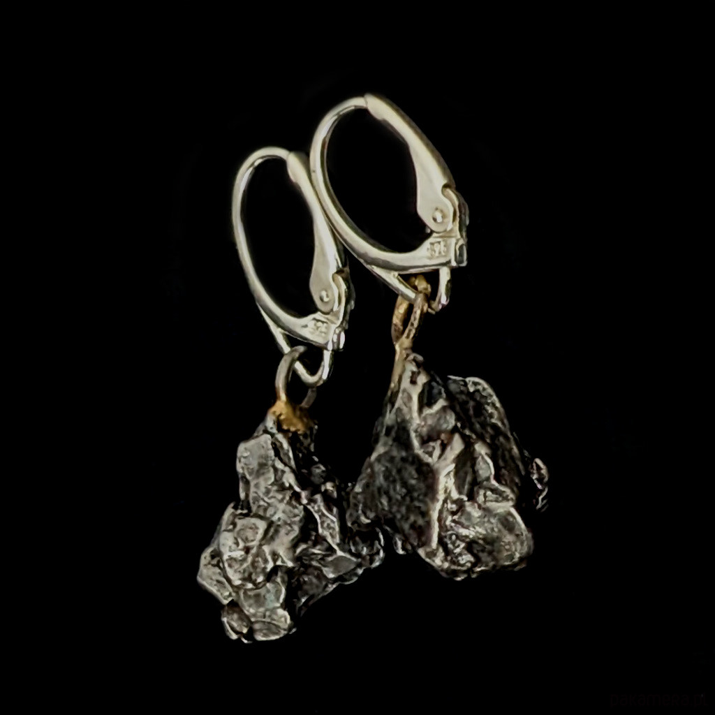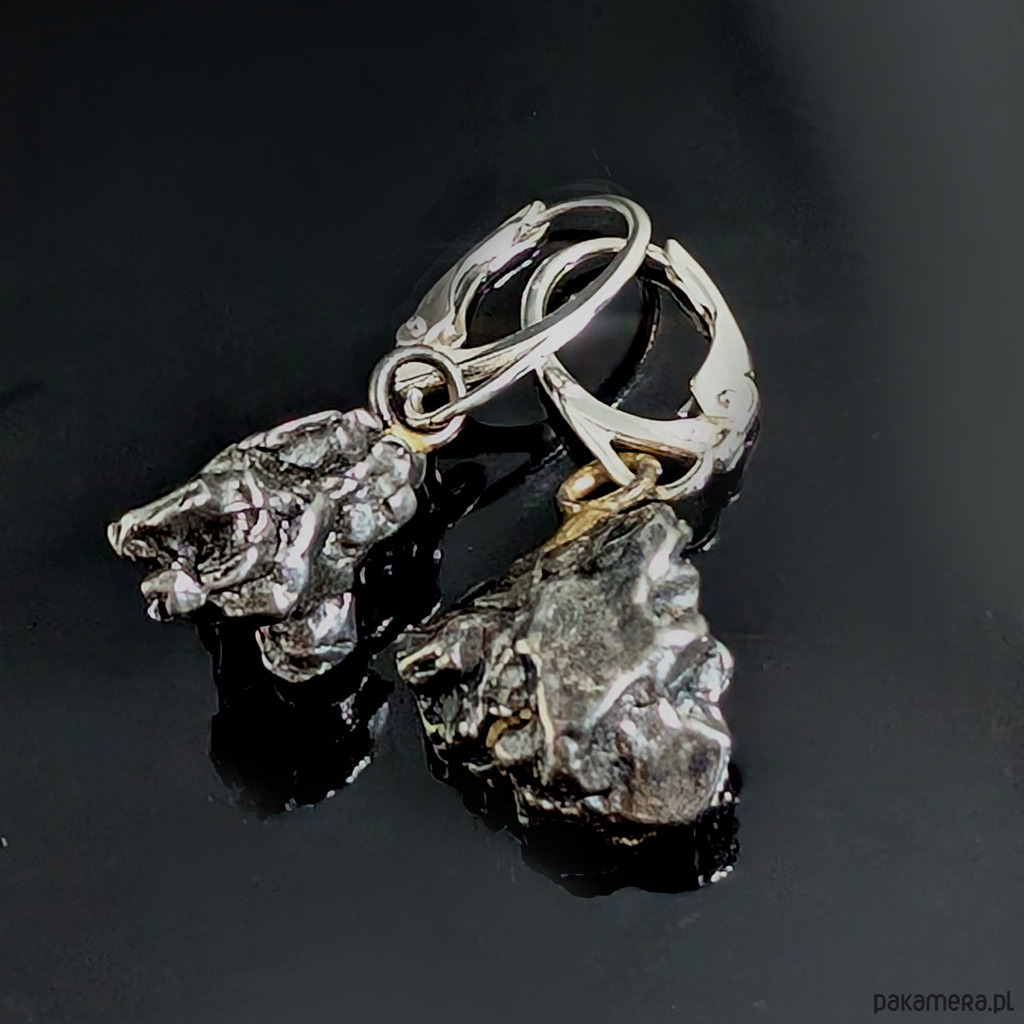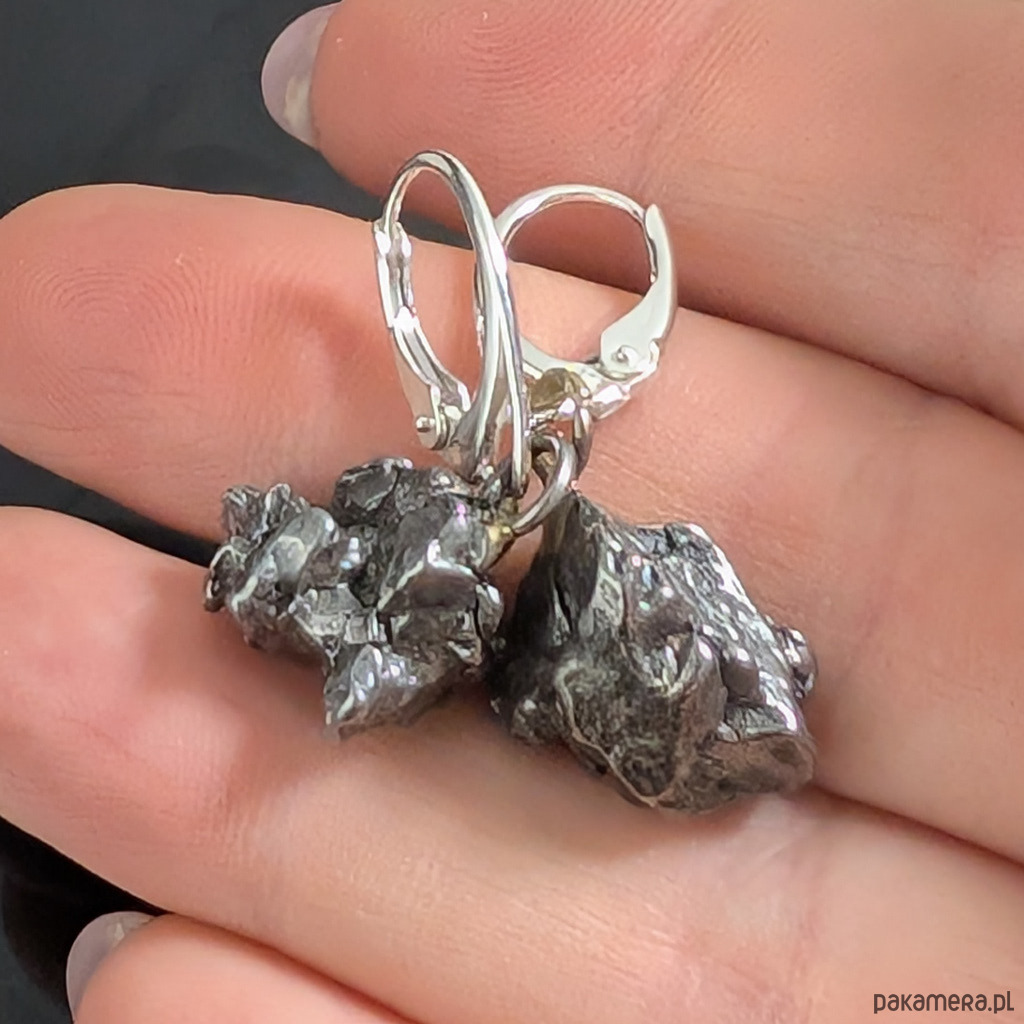 Kosmiczne kolczyki z meteorytami Campo Del Cielo (Argentyna) o kształcie nieregularnych bryłek na biglach angielskich ze srebra próby 925. Wymiary elementów 14 x 12 mm. Długość z biglami angielskimi 33 mm. Komfortowe w noszeniu i bardzo efektowne. Waga jednego kolczyka 6,2 grama. Kolczyki zostaną wysłane w ozdobnym pudełeczku.