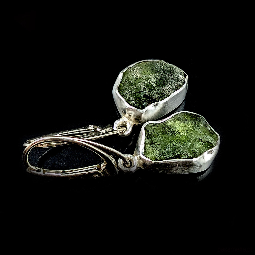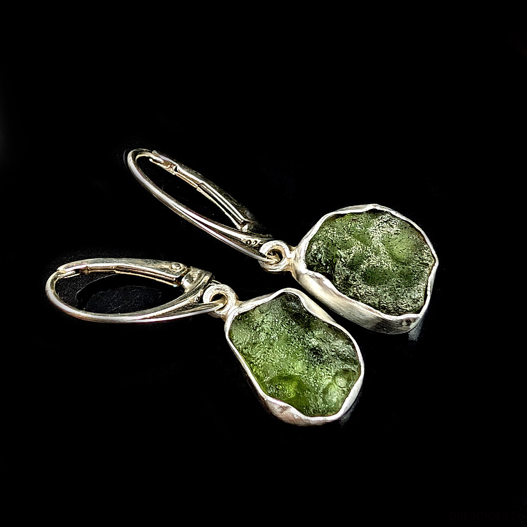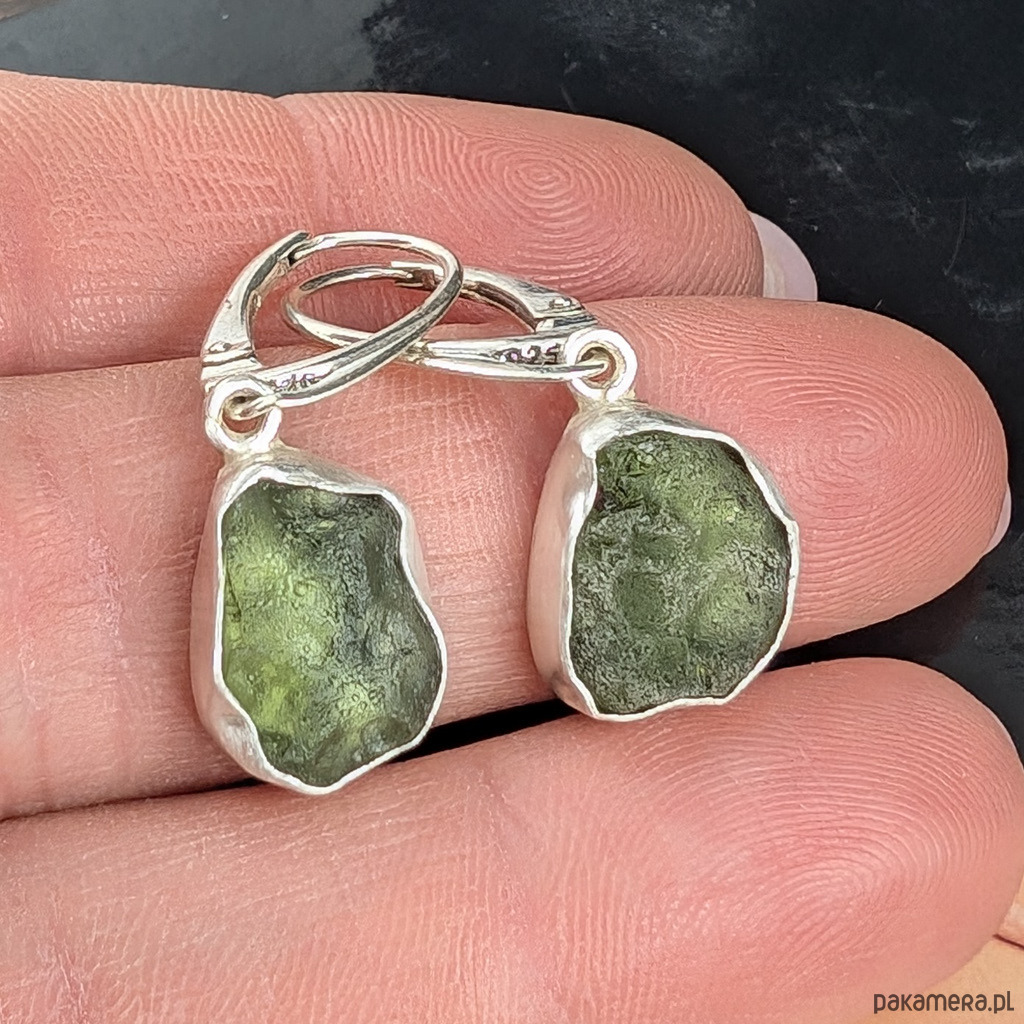 Kolczyki z oprawionymi w srebro pr.925 okazami rzadkiego mołdawitu. Mołdawit lub inaczej wełtawit to rodzaj tektytu,który pochodzi z krateru meteorytowego. Wiek powstawania zarówno krateru jak i mołdawitów szacuje się na ok. 14,5 - 15 mln lat. Mołdawity mają charakterystyczną zieloną barwę ( butelkowa zieleń) najlepiej widoczną po skierowaniu pod źródło światła. Wymiary oprawy kolczyków 12 x 10 mm, z biglem 31 mm Waga jednego kolczyka 2 g. Kolczyki zostaną zapakowane w ozdobne pudełeczko.