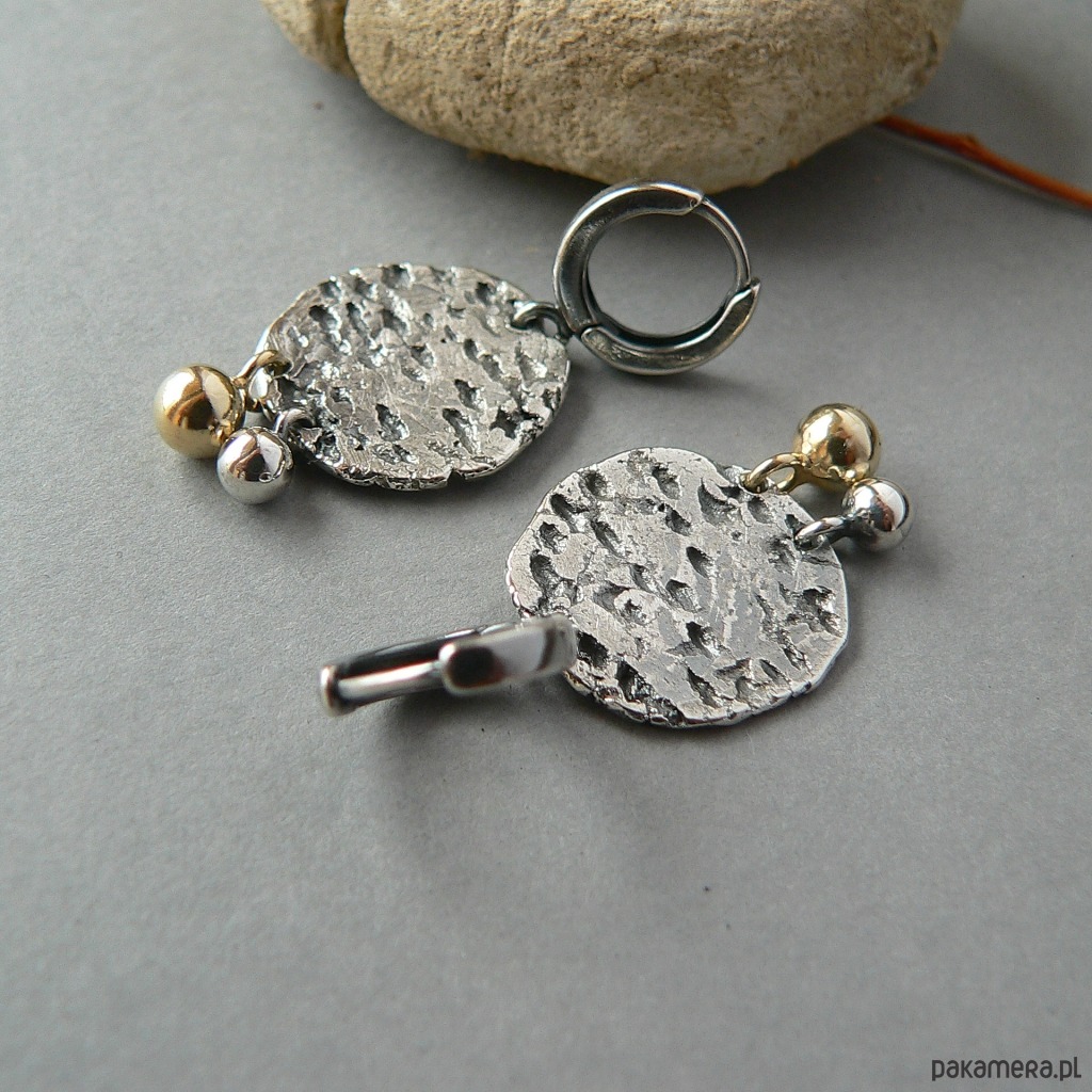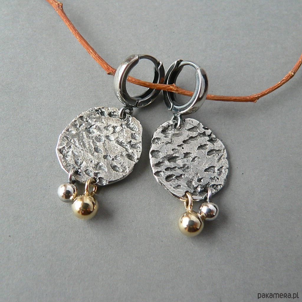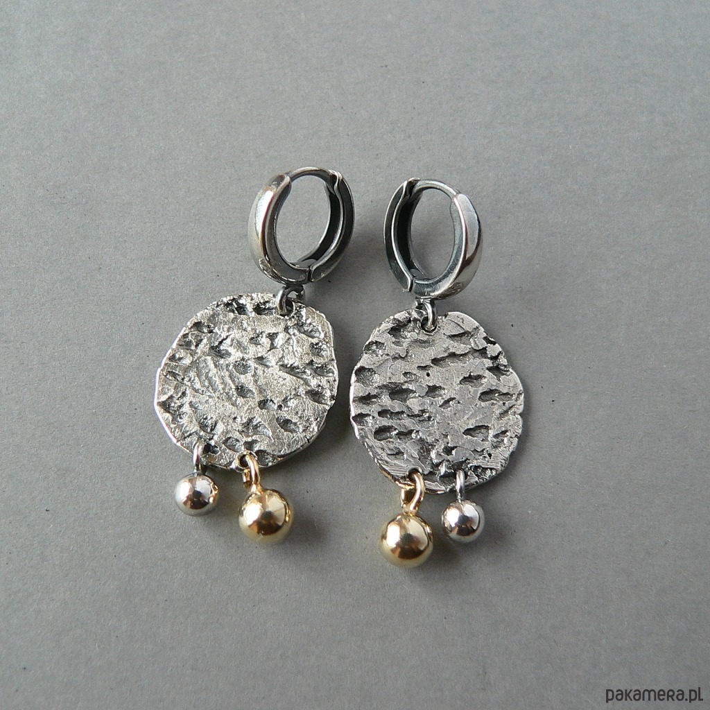 Srebrne kolczyki- surowe plasterki ze srebra formowanego ogniem w towarzystwie kulek o gładkiej, kontrastowej powierzchni, mocno polerowanej. Srebro oksydowane, większe kulki pozłacane. Wymiary plasterka 1,7/1,6 cm, elementy nie są identyczne. Średnica kulek 4 i 5 mm Długość całkowita kolczyka 3,5 cm